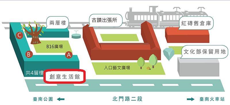 - 位置:由台南火車站(前站)出站後,往右步行約 3 分鐘即抵達園區。
