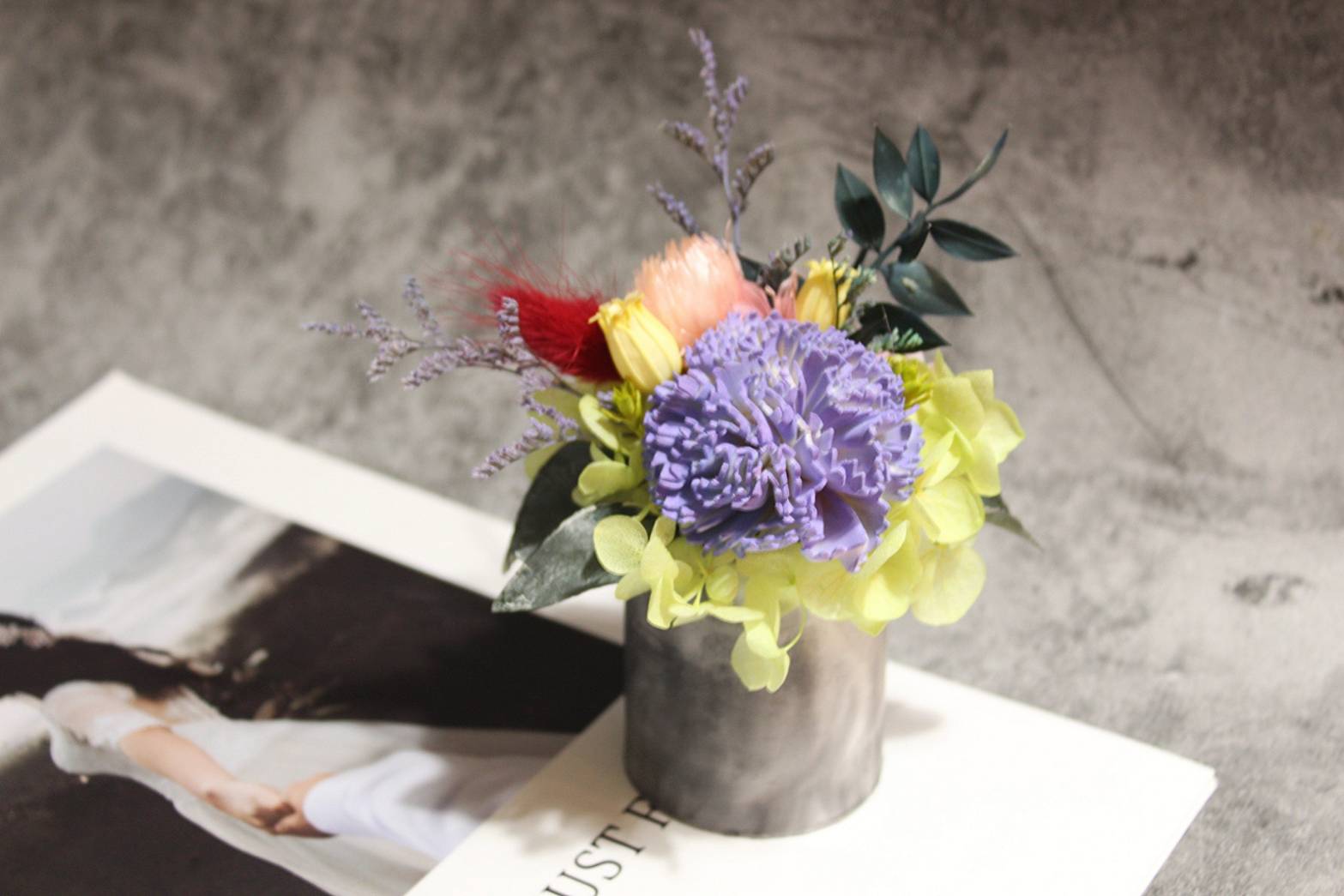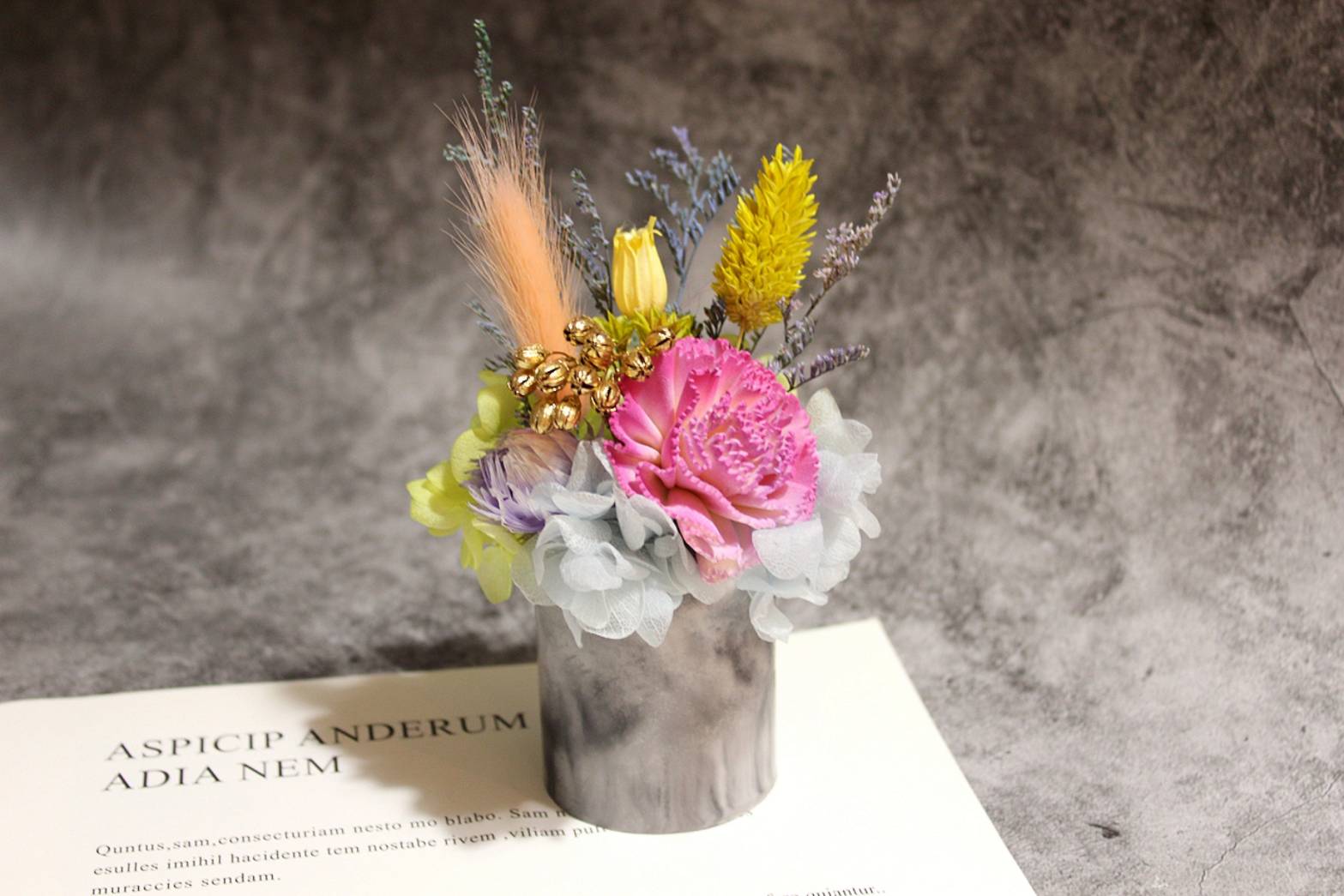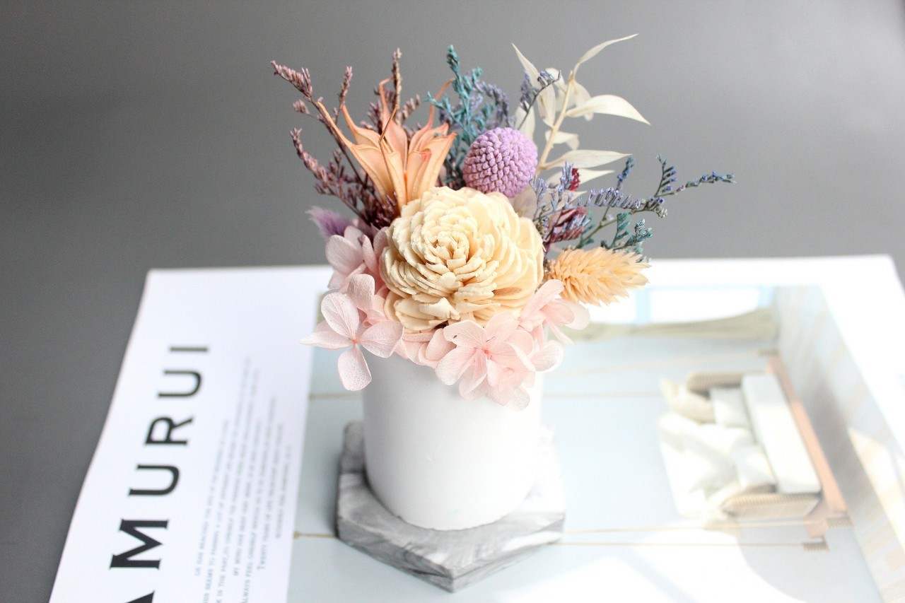 成品會有一組索拉花為主花的乾燥花盆,一罐5ML精油,和一個六腳或八角工業風石墊,精油可以滴在主花索拉花,或是石墊,都有擴香功能唷,快來體驗吧 !