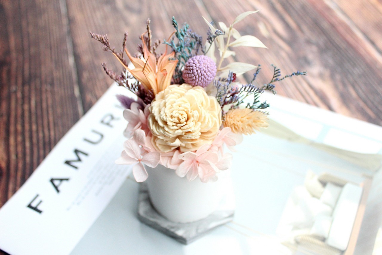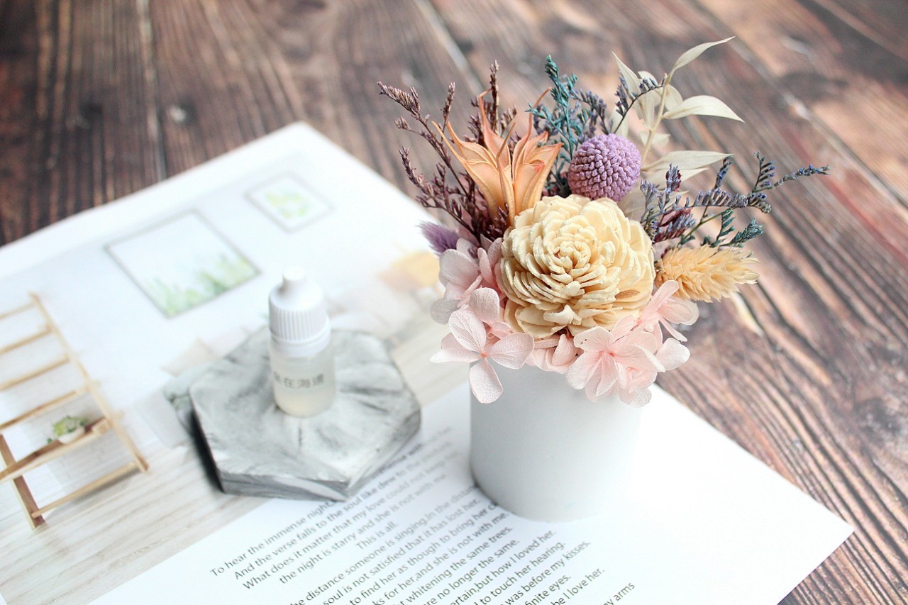 乾燥花一直是很多人喜愛的,原因是視覺上面會給人家很優雅,擺在能佈置的地方更能增添風采,但是乾燥花不能滴精油,因為太過潮濕還是會發霉,所以此款課程我們煮花選擇索拉花,索拉花是由木片製作而成的花,滴上精油擴香的效果很良好唷!