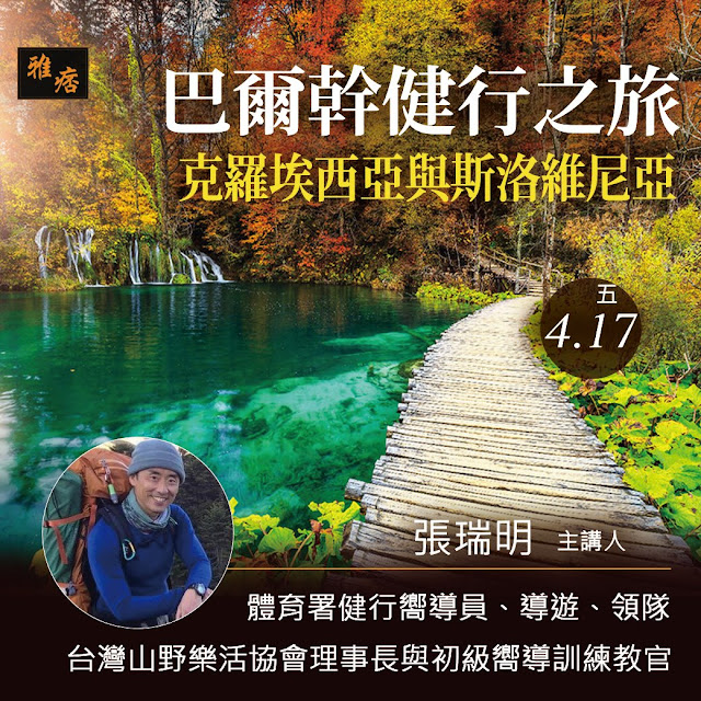 本場講座帶大家以「健行」的方式深入巴爾幹的自然景觀與古城小鎮,並介紹如何規劃健行旅遊。適合對「想去克羅埃西亞或斯洛維尼亞旅遊及健行,並瞭解其自然景觀」的人參加。
