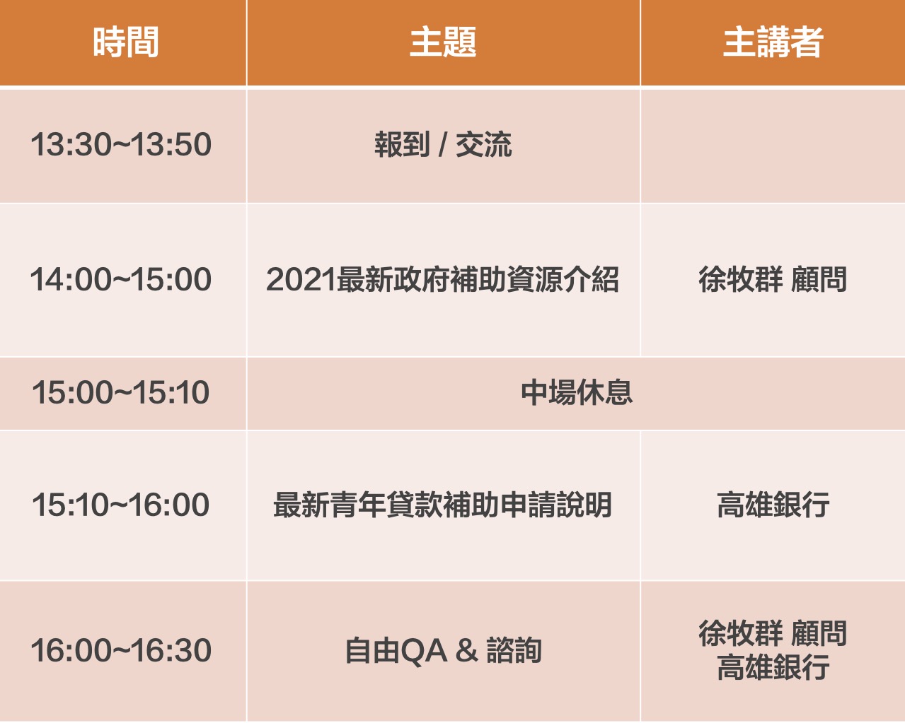 青年創業紛紛崛起,創業公司什麼都缺!尤其缺資金!政府雖提供不少為創業及創新研發相關補助,但補助與貸款到底哪個適合你?本次活動特別邀請到實力深厚的業師徐牧群及高雄銀行代表,針對最新的五年免利息青年創業貸款到底該怎麼申請?以及高雄市加碼補助的創業貸款等資訊,研發經費不能省!公司如何不自掏腰包研發資金申請政府補助?政府補助方案如何一把抓?!透過政府資源補助必會讓積極從事研發的中小企業/新創公司,為創新注入持續的動能!