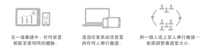 | 使用場景 | 協作會議,內部和外部會議,專案協調,線上展示 | 員工,上下游夥伴和客戶教育訓練; 認證和IT課程; 遠距教學 | 網絡研討會,產品發表會,員工大會 |