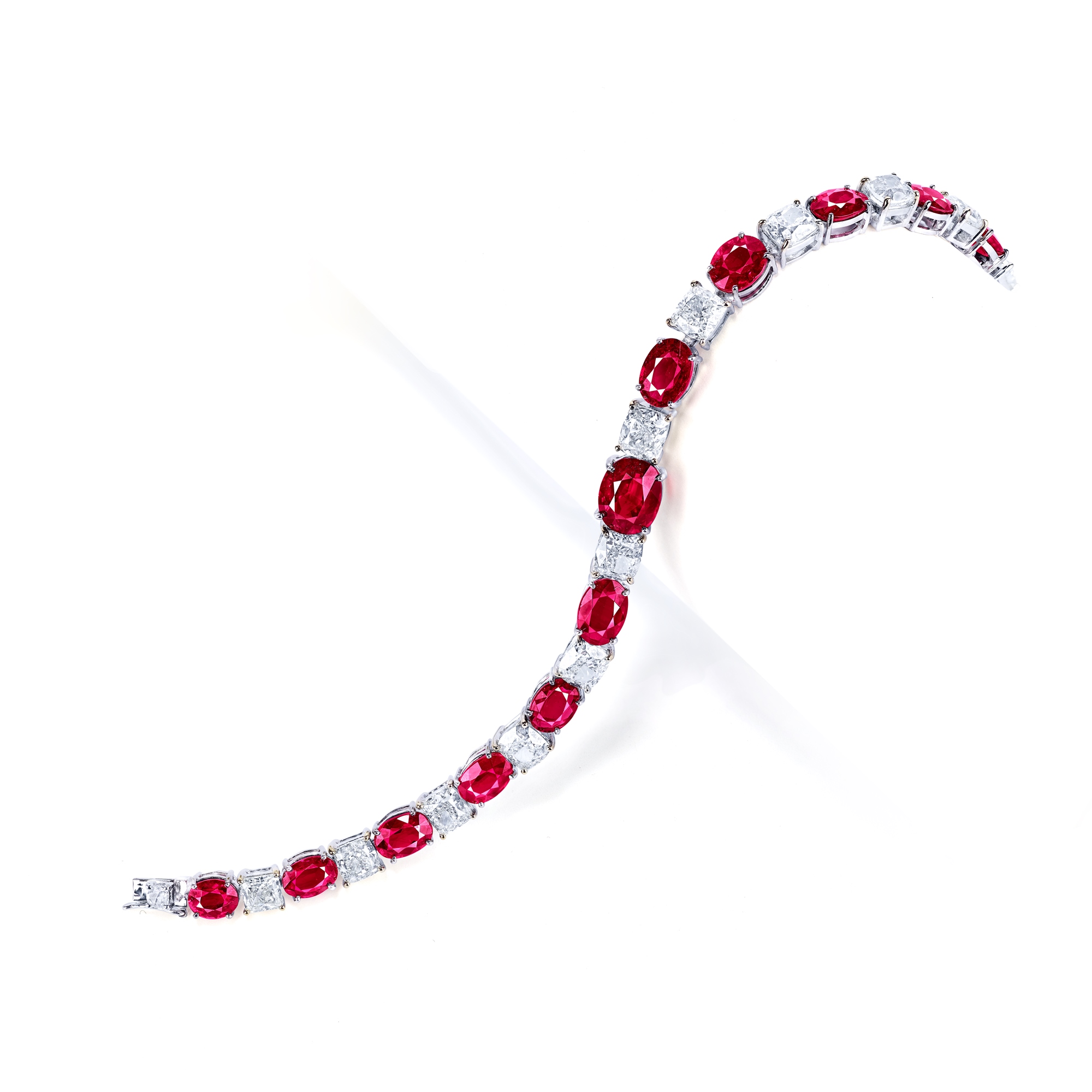 此手鍊共用12顆莫三比克天然無燒艷彩紅寶石,共約15.69克拉,整體設計貴氣非凡,不容錯過。