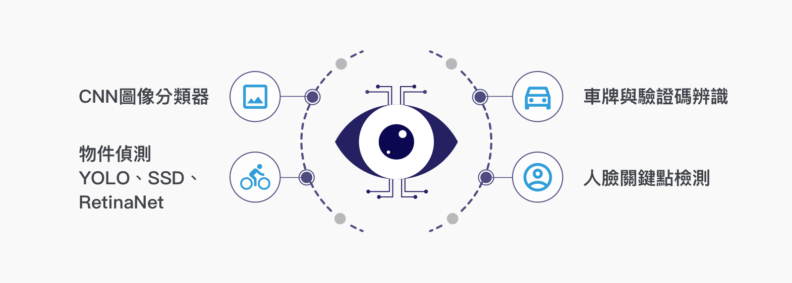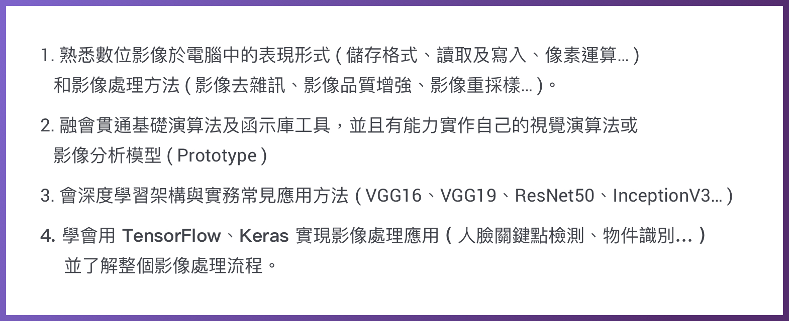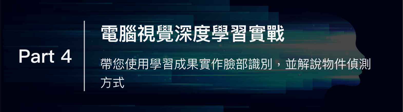 電腦視覺 (Computer Vision)為深度學習領域中相當熱門的研究領域,在產業界也有相當多的應用需求。本課程聚焦於電腦視覺技術與深度學習網路,從基礎的影像處理(OpenCV)切入,逐步帶領學員學習電腦視覺深度學習技術,包含卷積神經網路 (CNN) 基礎、經典 CNN 模型、物件偵測實作 (Object Detection) 與人臉辨識 (Face Recognition)、MobileNet 等。