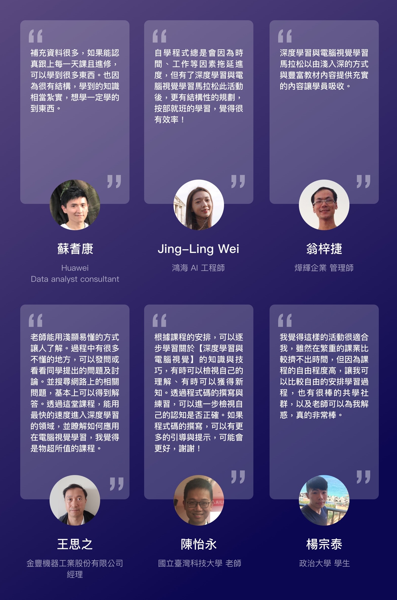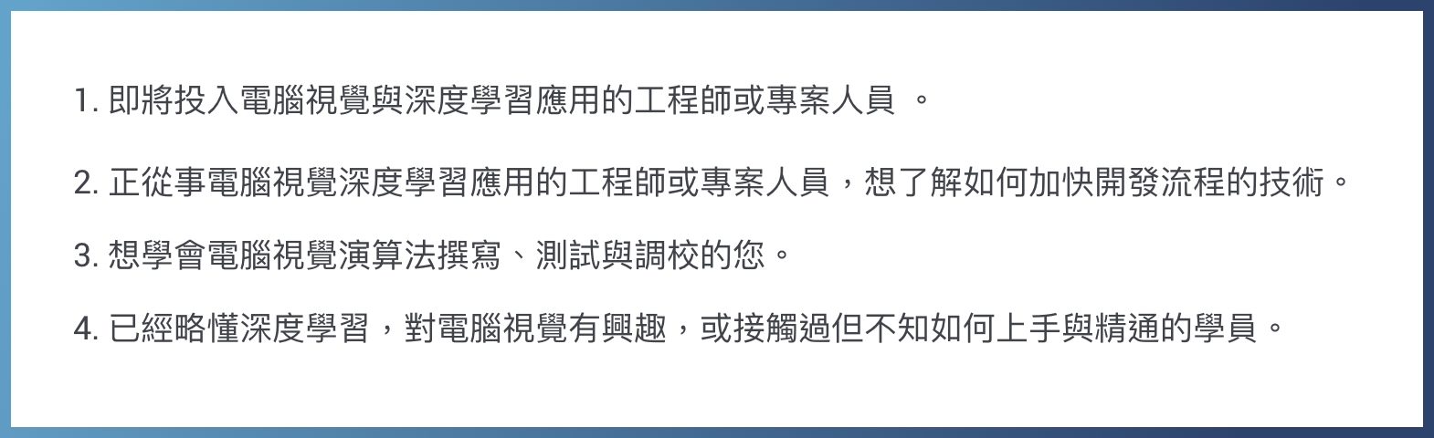 本活動發起目的為幫助 AI 學習者能以更高效率學習電腦視覺 X 深度學習技術。因此我們匯集該領域的資料科學家與專業的機器學習工程師,彼此分享與優化最佳的學習路徑,幫你高效地掌關鍵知識。本活動課程規劃的核心理念,是為了讓每位學員在完成學習後,能親自將所學知識應用於期末專題,以理論與實作並行的方式編排課程內容,並由業界的領域專家親自回答您在學習過程中遭遇的疑難雜症。