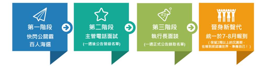 此計畫核心重點,旨在透過 【多元情境評估】機制,在篩選、面試、訓練中都能讓新聲代充分展現長項,讓新鮮人可以在具備清楚方向與步驟的計畫中,加速發展成獨當一面的專業公關顧問。