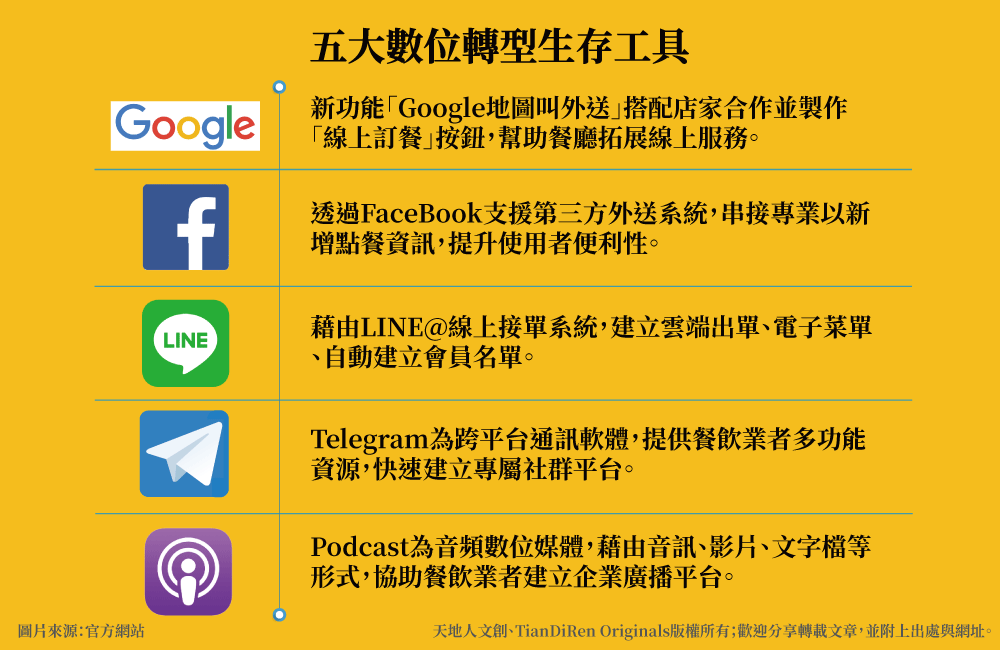 新型冠狀病毒疫情延燒,餐飲業承受著有史以來最沉重的衝擊,為防堵疫情,許多顧客不上門用餐、造成店面人事成本與租金壓力排山倒海而來,嚴重打擊店家與消費者信心。所謂危機就是轉機,優良的餐飲業在此時絕非等待時機,而是找到適合的學習管道獲取立即見效的重要知識,並將想法付之行動。