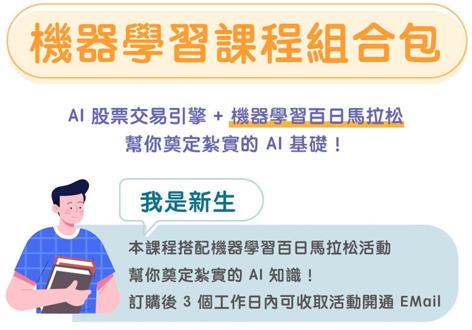 對於想應用 AI 技術於股票交易程式的同學,本課程超值加贈「機器學習百日馬拉松」(價值$ 1,990),提供 1+1 豐富的訓練課程,帶你學習 AI 底層知識。當你具備了紮實的機器學習基礎知識,將能更全面地打造與調校專屬個人的股票現金製造機。