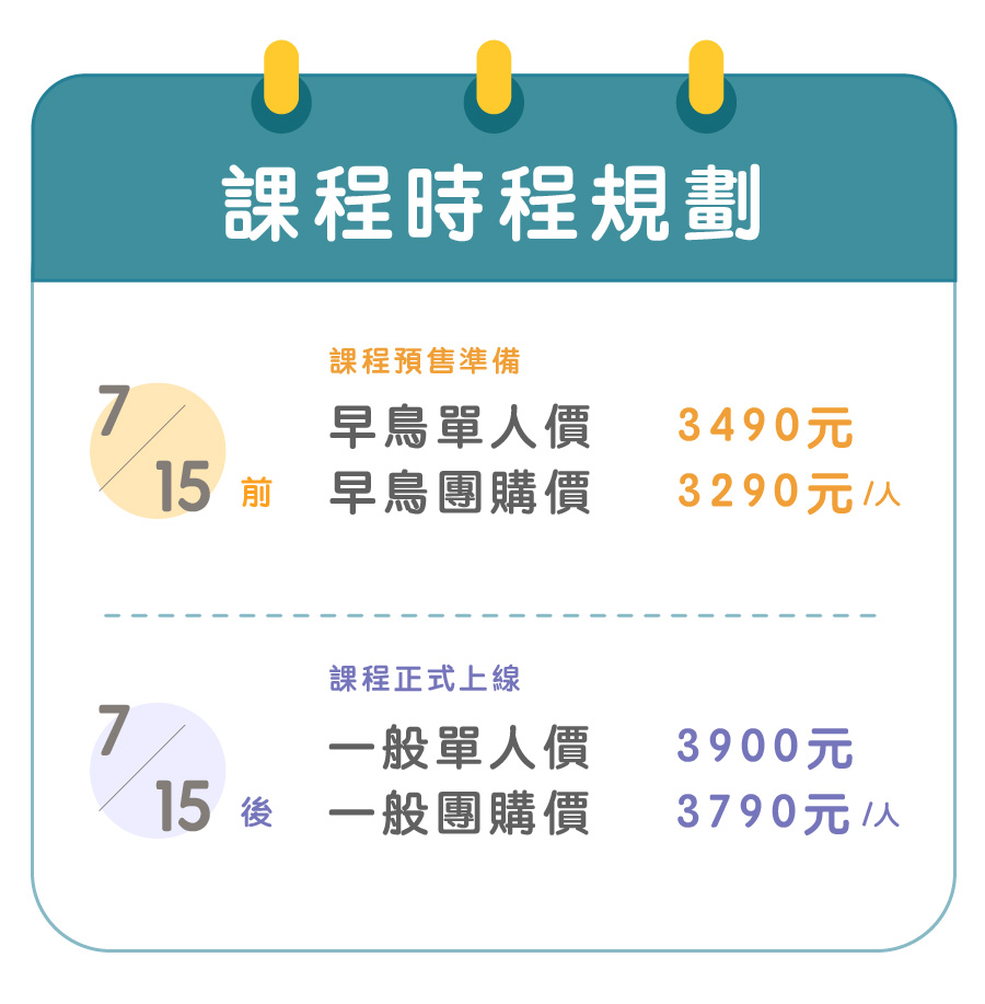 7/15 號之後 課程正式上線,票價恢復原價 ,單人票價 $3,900 元,多人團報優惠價 $3,790 元/人。