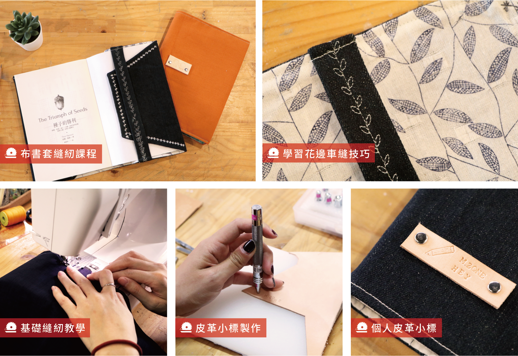 多款風格布料供你選擇,再教你裁縫機的基本使用方式,除了直線車縫技巧外,還能挑選喜歡的花邊樣式,縫出不一樣的花邊車縫線,在細節中呈現精緻巧思,做出特色手工布書套,最後還能在封面還可以敲印英文字母皮革標籤唷~在3小時的課程中,一次學習縫紉技巧,還能認識皮革小標籤製作。