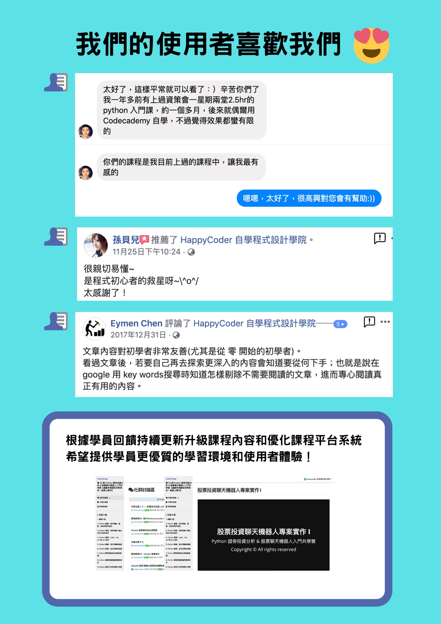 HappyCoder 自學程式設計學院是一個自學程式設計(Programming)、電腦科學(Computer Science)交流學習社群,團隊成員擁有台大等一流學府資訊相關科系及知名上市科技與知名網路軟體新創公司業界資深工程師背景。我們致力於推廣學習程式設計運算思維和解決問題的能力,過去已成功輔導三千多位學員跨領域自學程式設計。希望透過自學程式設計培養學員學習跨領域知識的自學能力!