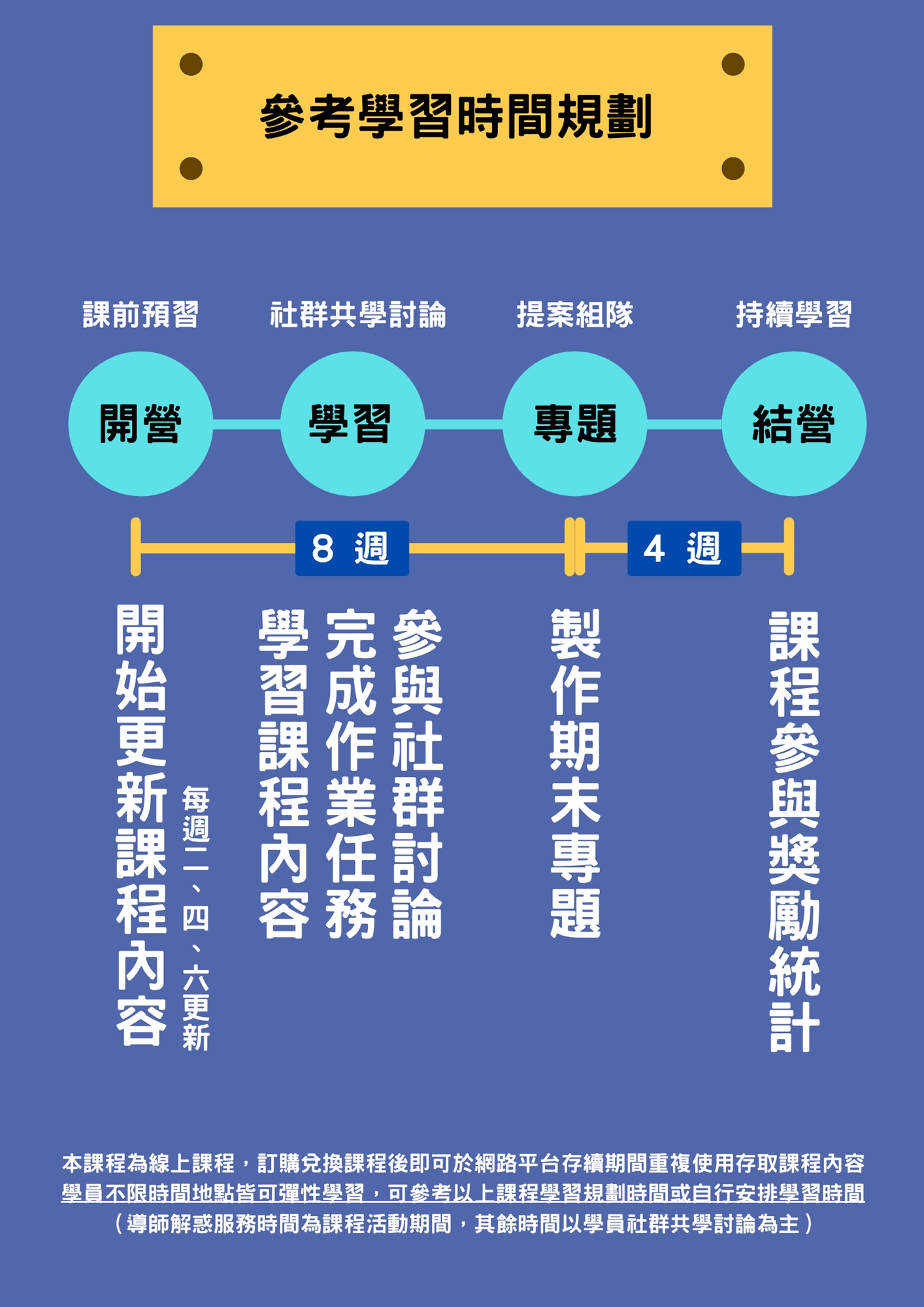- 本課程活動採線上方式進行,若已成功訂閱課程即可於課程網站不限次數重複使用內容。課程每週根據頻率更新課程內容,可以自行安排學習時間,不限時間地點皆可學習,沒有幾點幾分上課時間的規定。但有提供學習建議時間可以參考作為作業任務和學習時間安排方向,符合作業任務提交規定則者可以申請電子結業證書。導師解惑指導和知識問答服務時間主要為營期活動期間,課程活動結束後將以同儕社群共學討論為主。