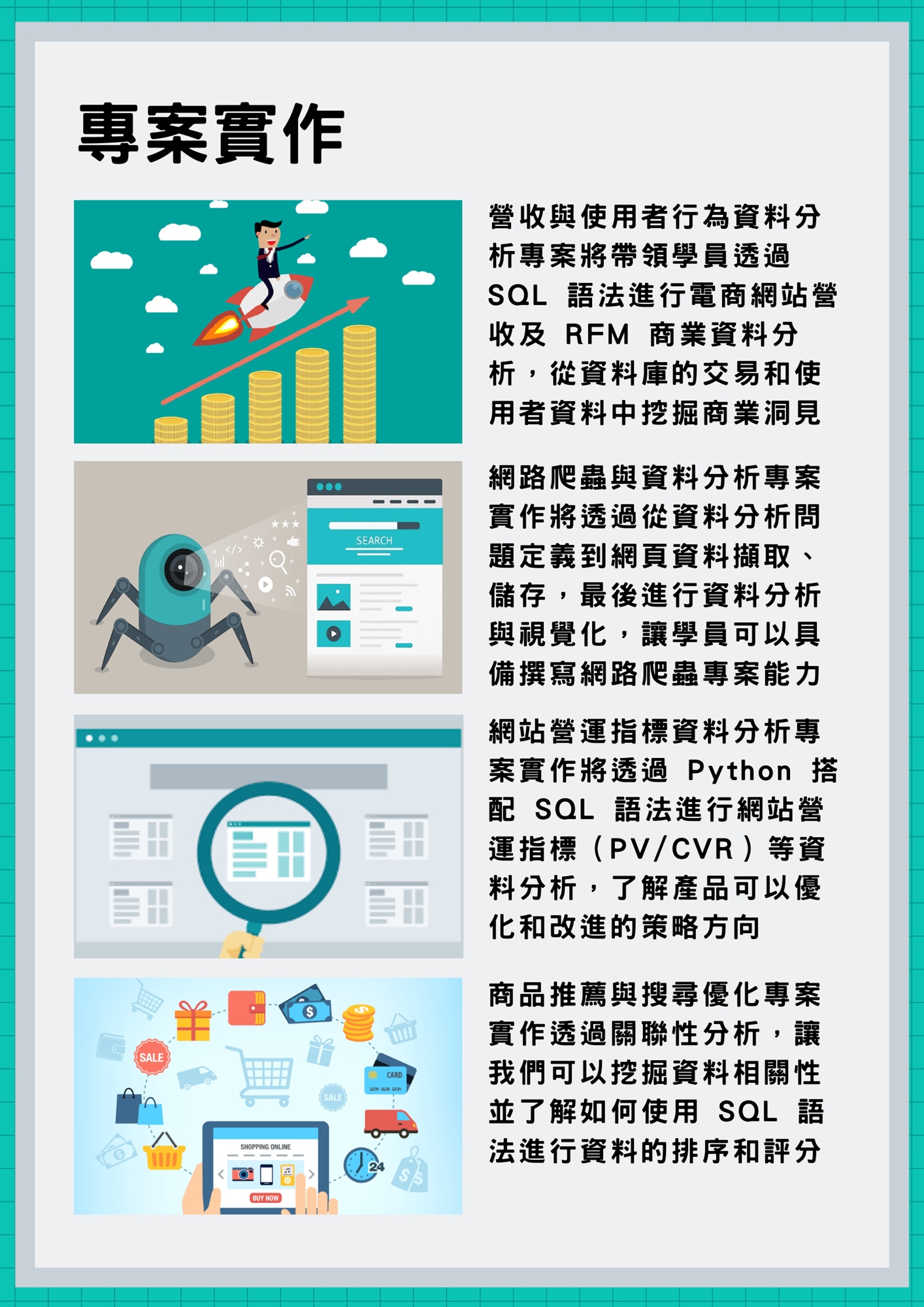 - 建立 Python / SQL 商業資料分析(business data analytics)和網路爬蟲資料擷取基礎和專案實作能力