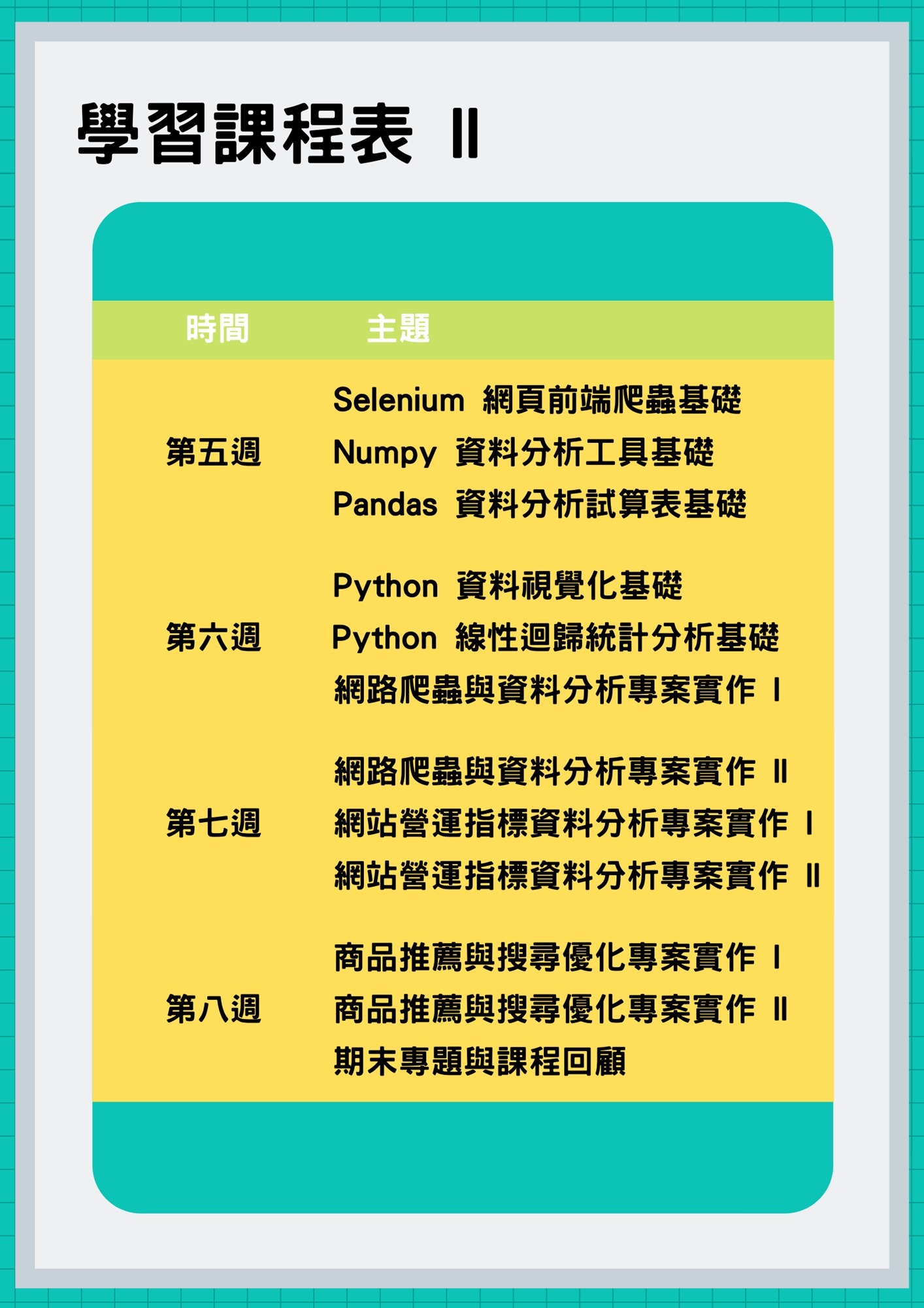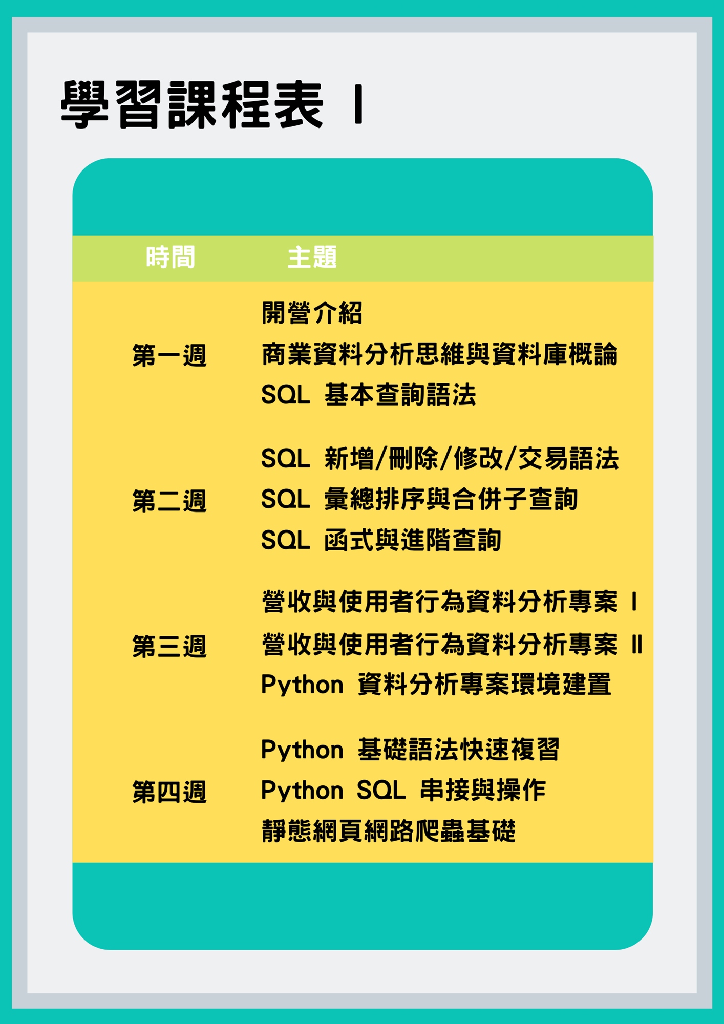 - 本共學營不適合:已經掌握 Python / SQL 商業資料分析觀念和專案開發能力的同學