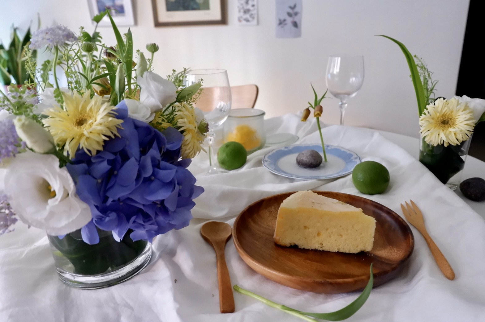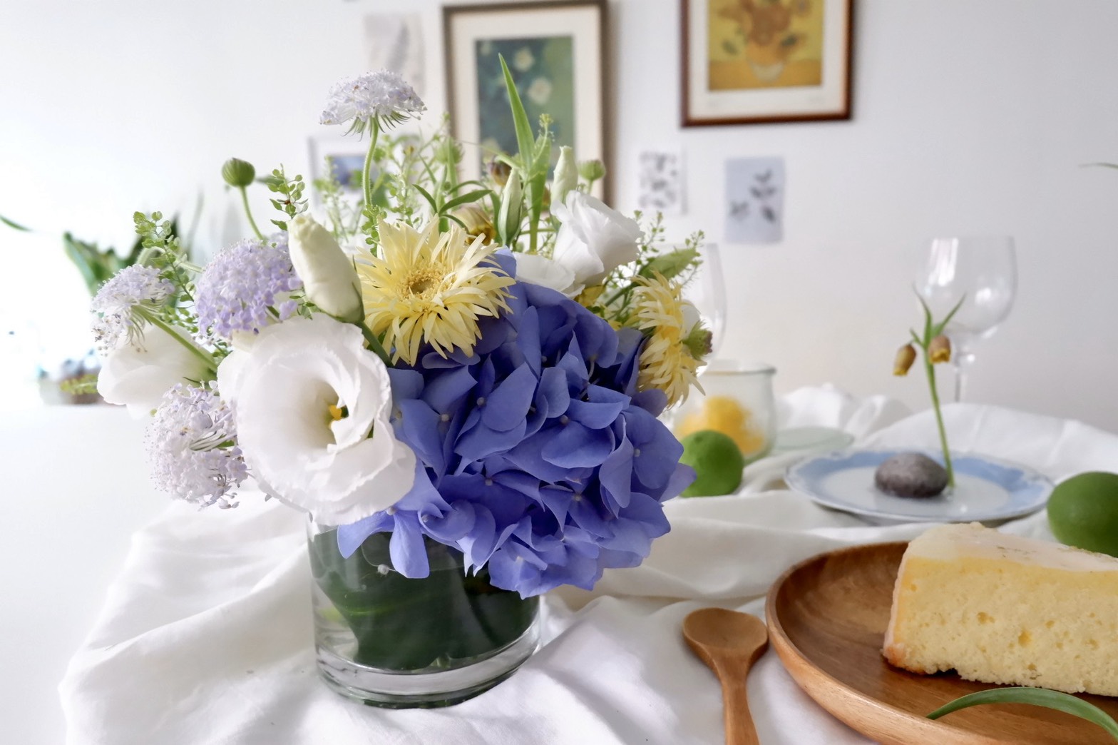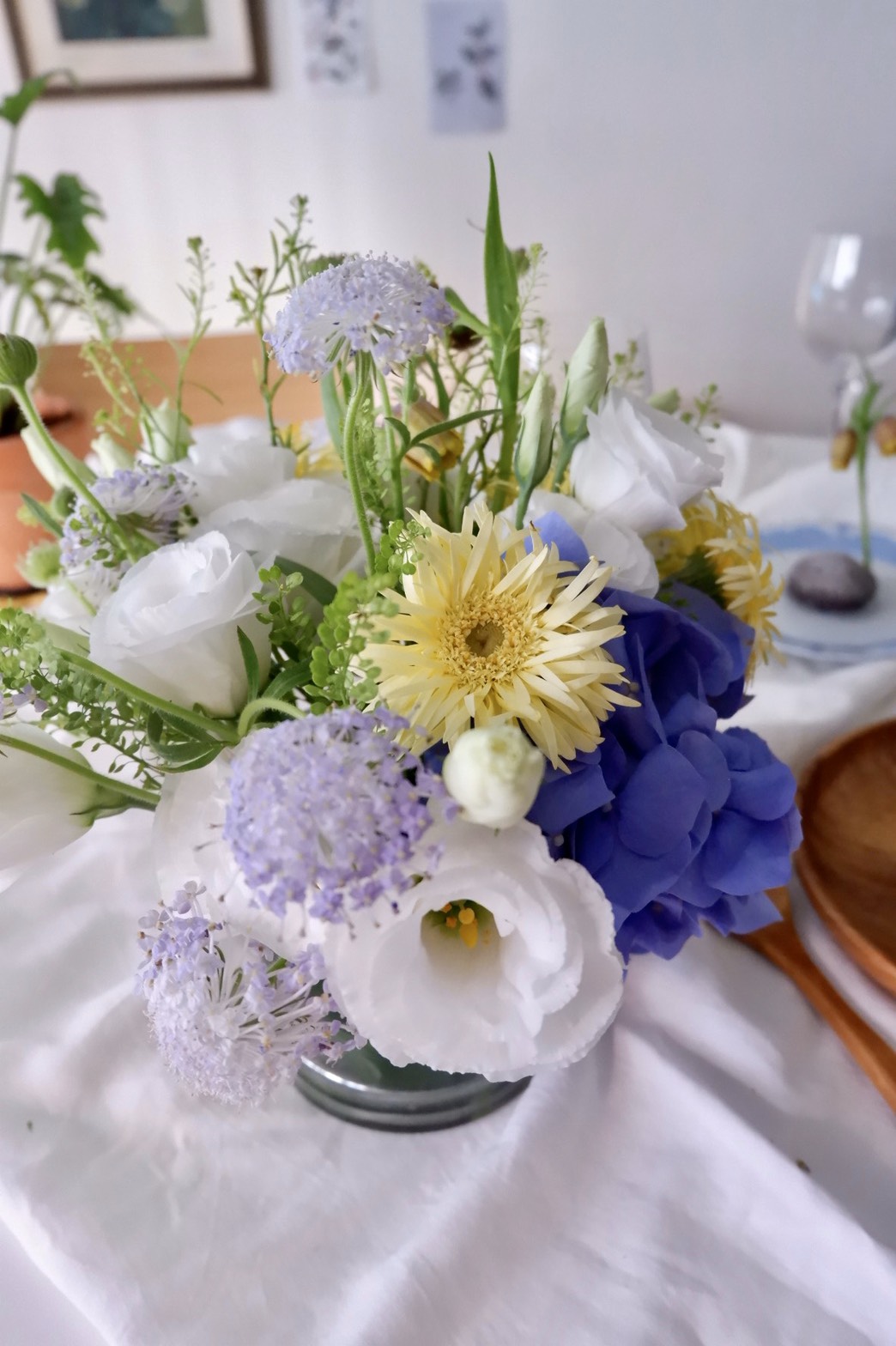 課程選用台灣初夏盛產的繡球花作為主角以及白桔梗、鵝黃羽毛太陽花、粉紫翠珠、珍珠草、貝母花等花材,色系是夏日清爽的水彩印象,打造視覺清涼的愉悅感。