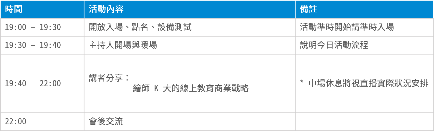 • 此活動採線上直播形式,準時開場、準時授課。遲到、中途離席者,主辦單位有權開放不予提供進入