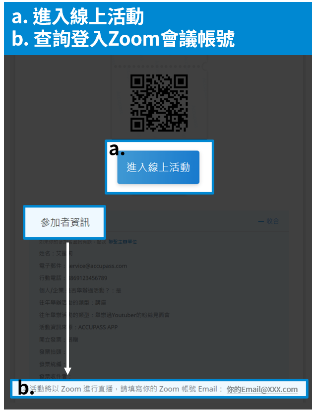 * 查詢報名表登記 Zoom 帳號,請進入「我的票券」→「快速取票」→ b.「參加者資訊」