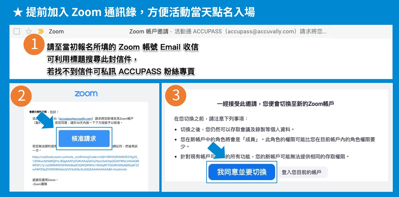 1. 為方便點名,請找到 Zoom 的通知信,並核准按下同意切換,加入我們的活動用通訊錄