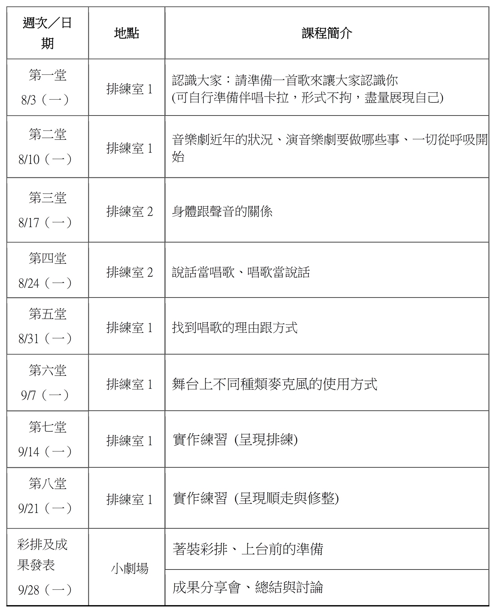 時間:8/3-9/21,每周一14:00-16:00