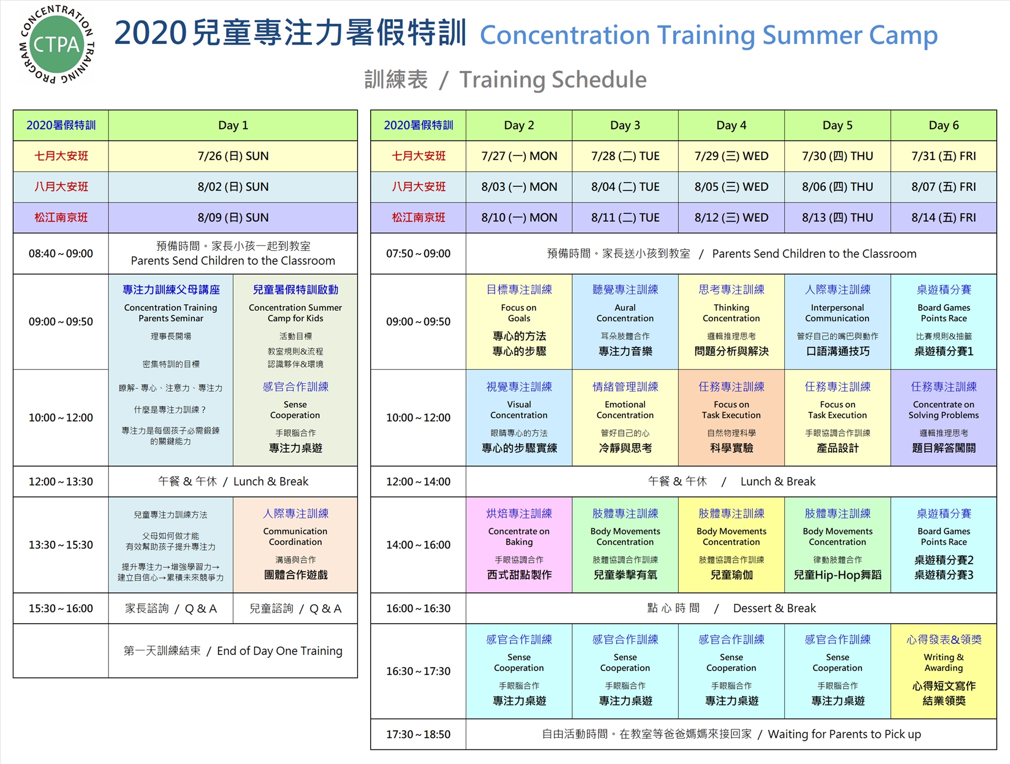 *一梯次的訓練時間是週日至週五每天 9:00~17:30 (上午7:50起家長可送小孩到教室,下午17:30~18:50到教室接孩子)。