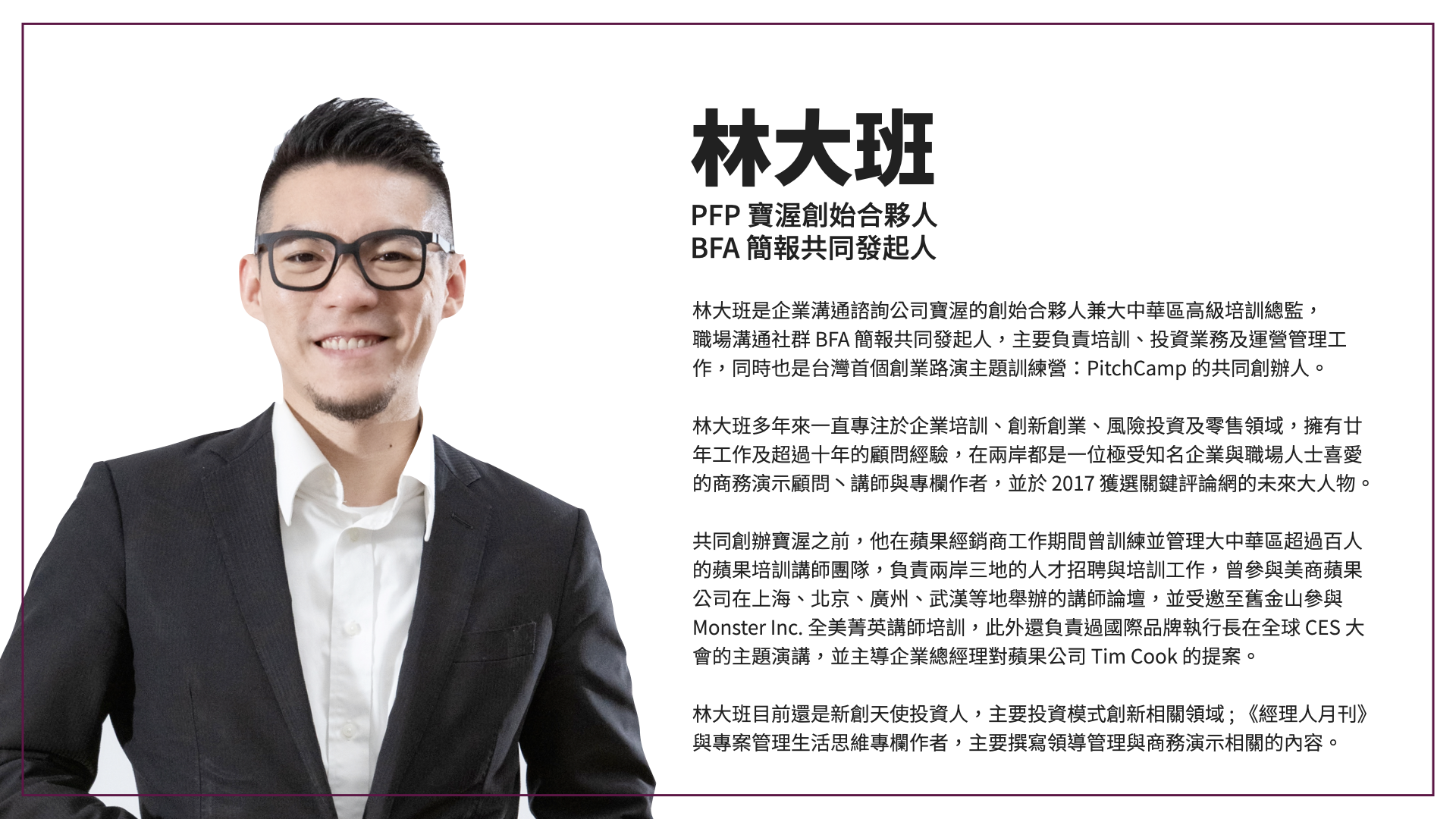 林大班是企業溝通諮詢公司寶渥的創始合夥人兼大中華區高級培訓總監,職場溝通社群 BFA 簡報共同發起人,主要負責培訓、投資業務及運營管理工作,同時也是台灣首個創業路演主題訓練營:PitchCamp 的共同創辦人。