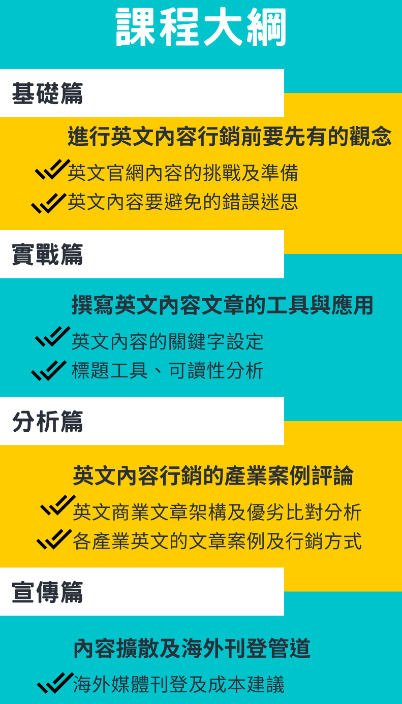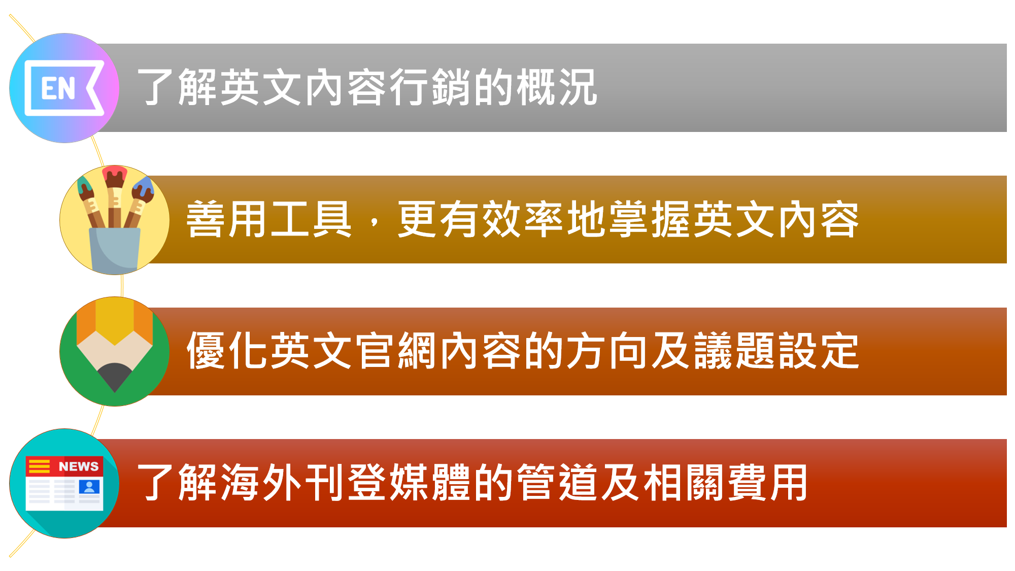 本次課程,資深媒體人暨內容行銷專家張瑋容老師,將告訴你如何用 4 步驟做好海外內容行銷。這絕不是一堂英文課,而是一堂讓你在海外超越同業的內容行銷戰略班,不管你是B2B或 B2C ,都將能透過國際化的內容將品牌和官網內容成功推向海外,進攻全世界!