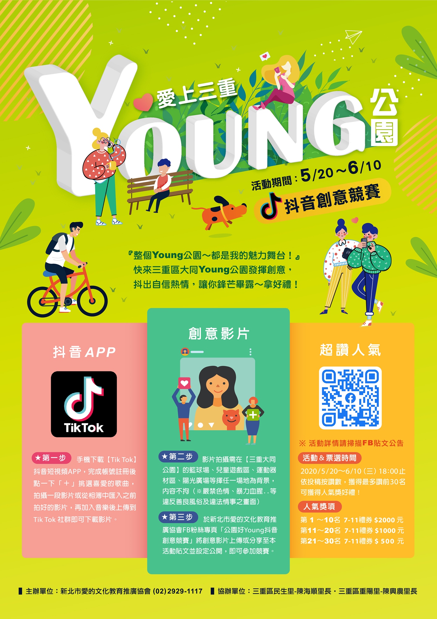 新北市愛的文化教育推廣協會,致力於教育文化與在地社區活動結合的協助及推廣,舉辦「公園好young-抖音創意競賽」,歡迎喜愛表演的民眾一起來三重區大同young公園發揮創意,「抖」出自信熱情,就有機會讓你鋒!芒!畢!露!拿好禮~🎁🎁🎁