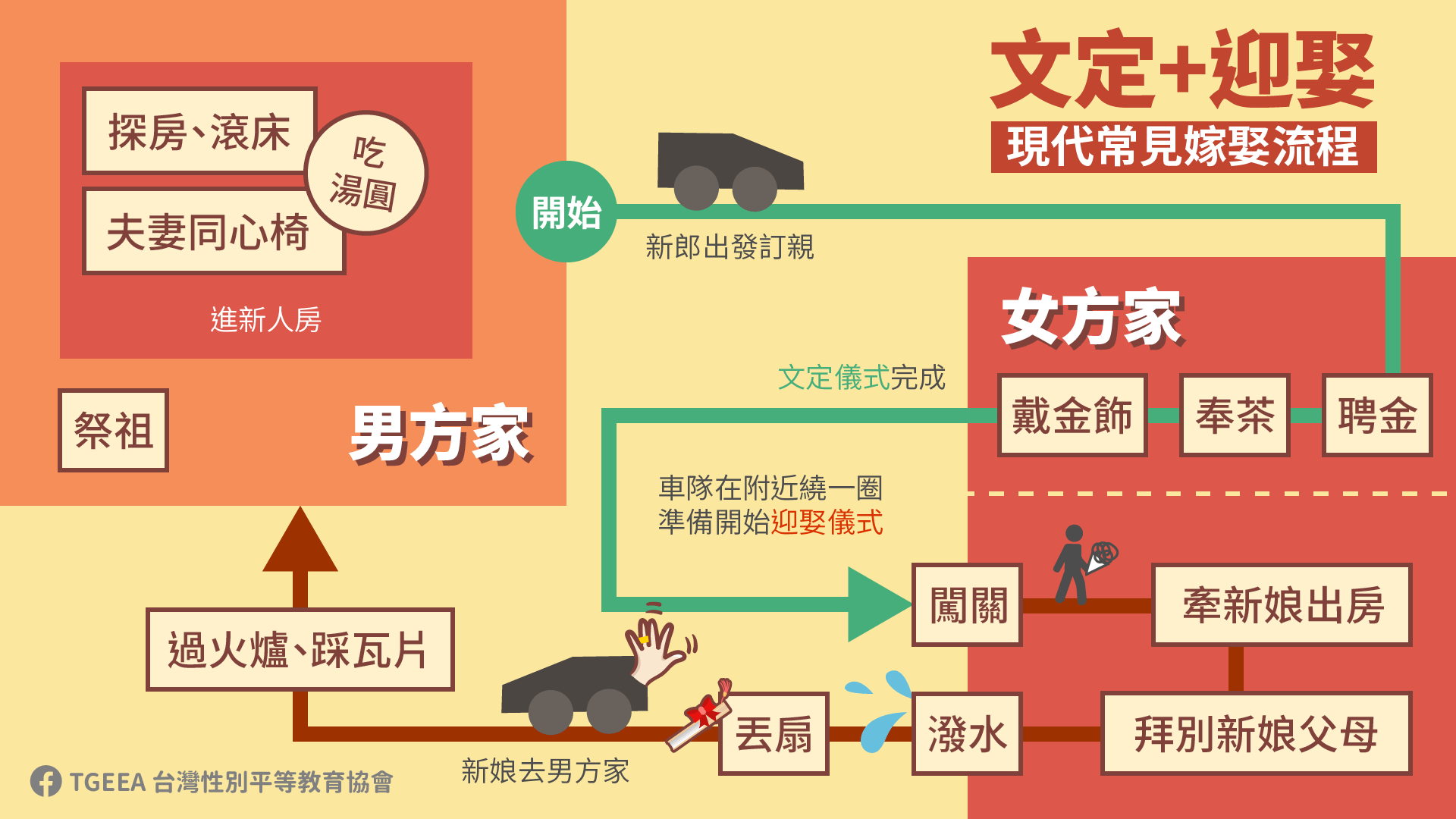 一般的異性伴侶在面對一連串的嫁娶儀式時,通常只能照做,沒有什麼自主空間,更別說去質疑其背後的意義了!