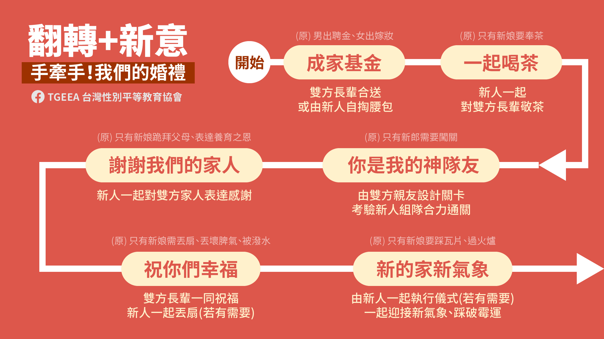 翻轉與思考:想想看,是否可能創造一套具有平等、自主內涵,屬於自己和伴侶的創意婚禮?與長輩的溝通又該注意那些細節呢?