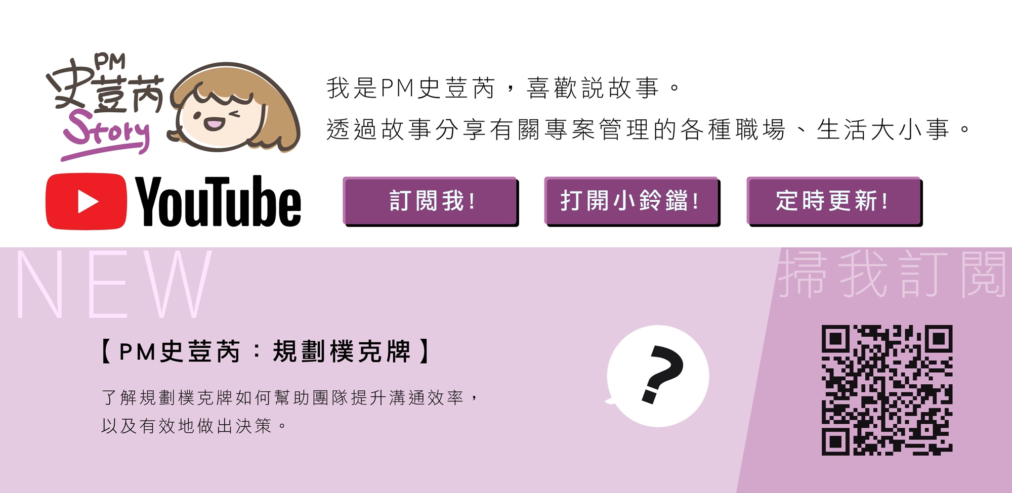 我是史荳芮,喜歡說故事,透過說故事分享有關專案管理的各種職場、生活大小事。