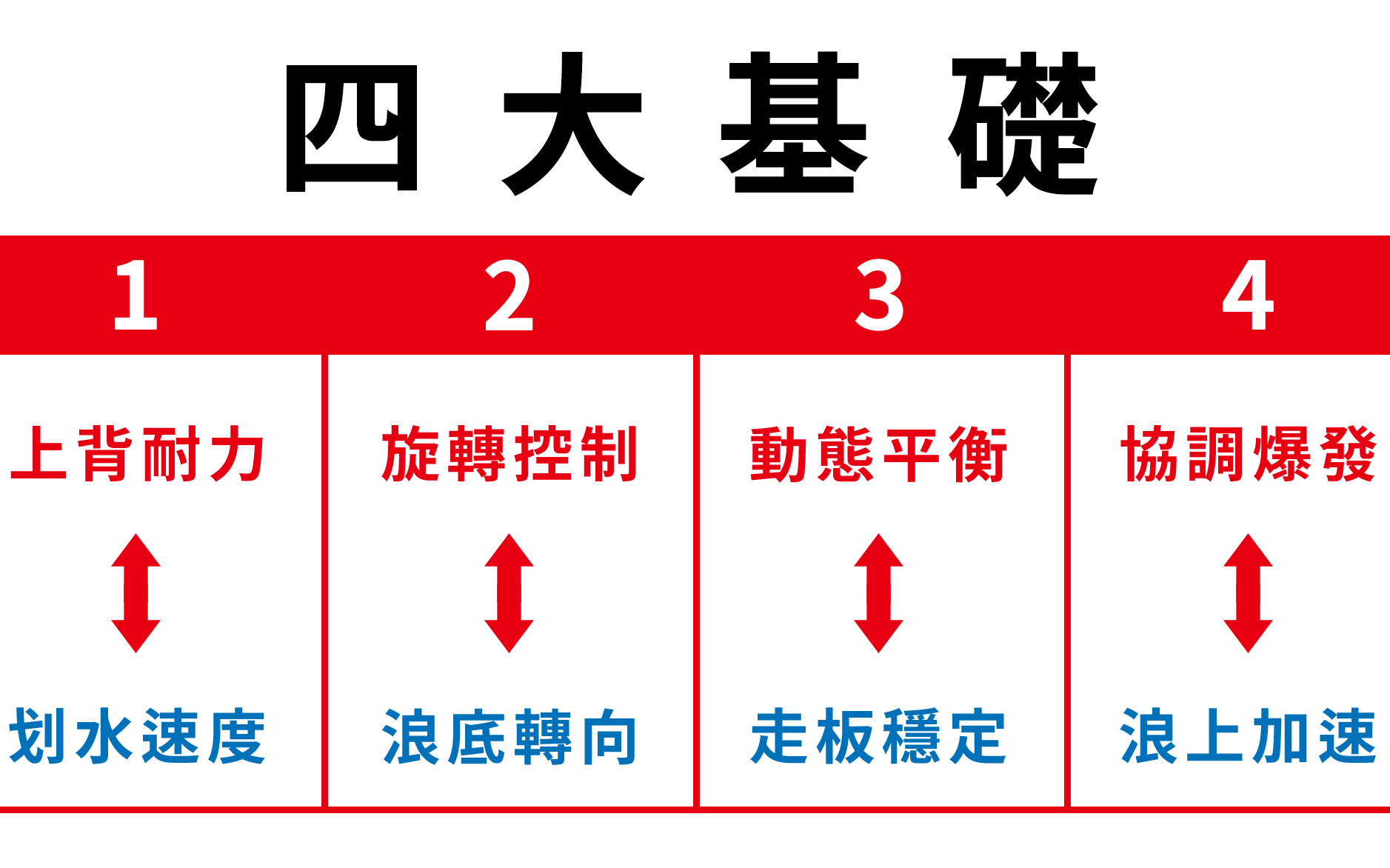 透過專門為衝浪動作設計的課表,你將能用最有效率的方式,逐步增加肌肉表現。一次滿足成為高手的四大基礎。