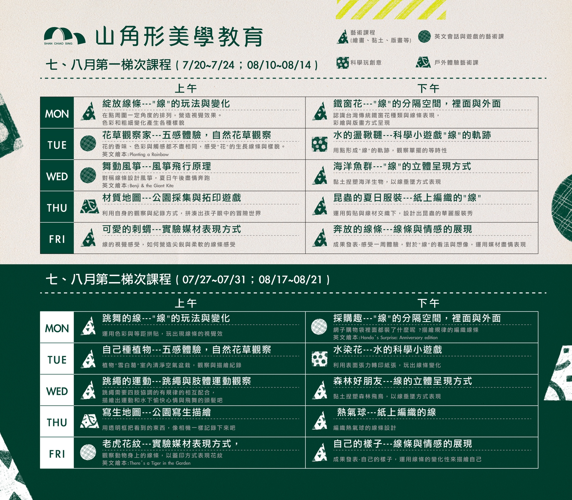 山角形藝術夏令營增添戶外體驗、科學遊戲與英文會話,讓暑假藝術體驗更精彩有趣,開啟感官新體驗。從輕而易舉的"線條"為主題;多一點觀察、多一點體驗,增加對生活周遭的感受力,用藝術玩創意,等待我們一起大發現。