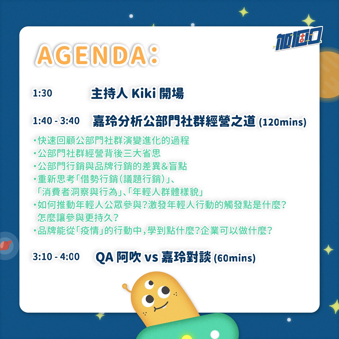 這次《加個零的社群觀察》就用三個小時,好好的聊聊—為什麼品牌在當時無從施力?甚至很多套路操作都失靈了呢?到底這一連串公部門社群操作背後有哪些天時、地利與人和?社群又如何改變了政治跟社會的運作方式?品牌又該如何借鑑公部門的社群經營之道,佈局疫情過後的下一步?