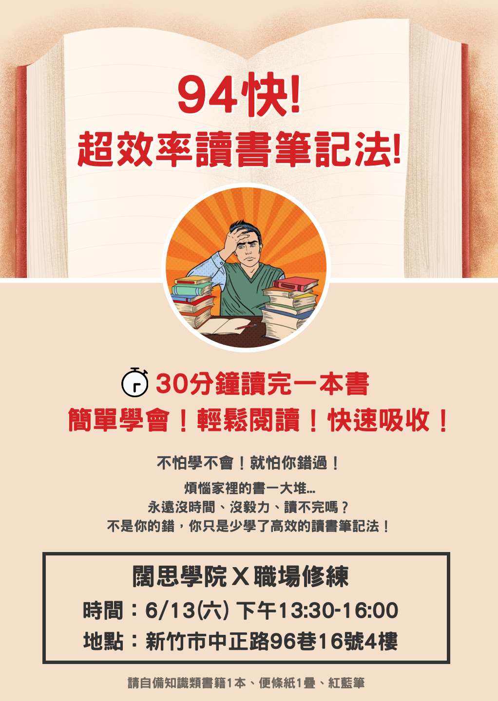 📣 學員需自備:知識類書籍一本、便條紙一疊、紅藍筆各一支