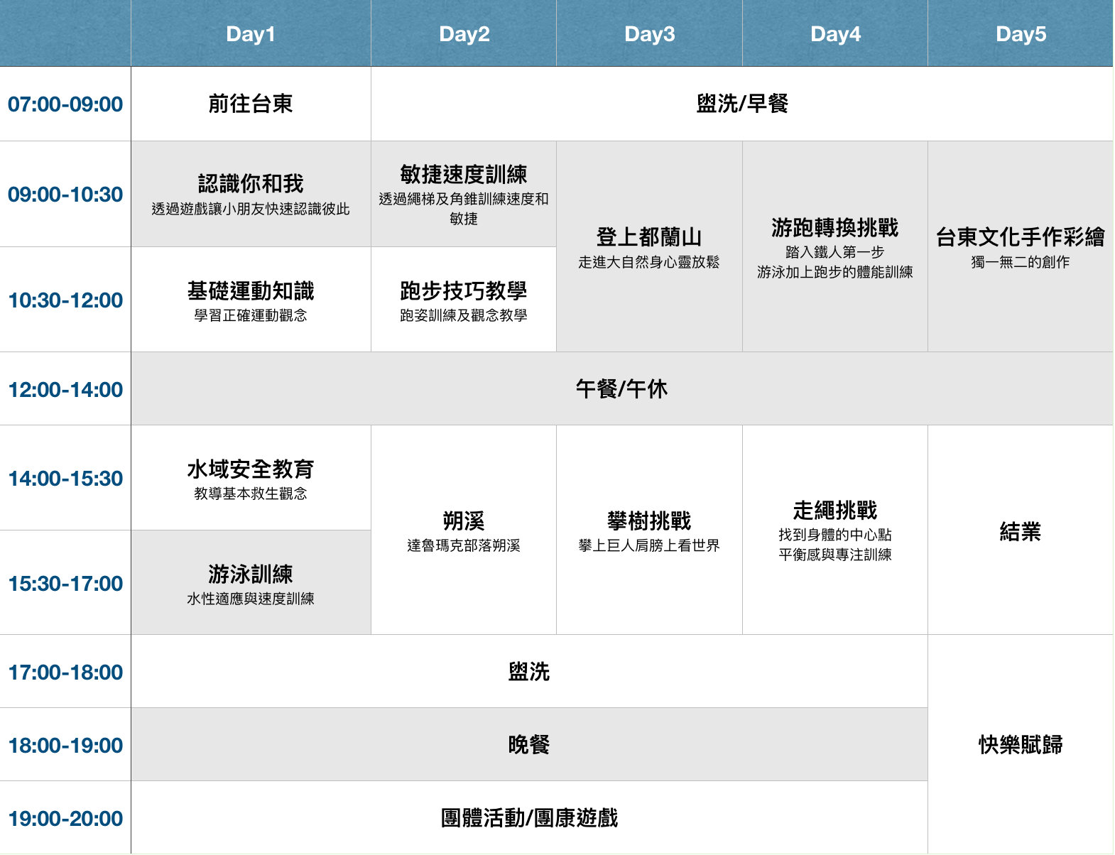 每年的寒暑假都會舉辦小朋友的訓練營,利用當地的環境再結合當地的文化特色,舉辦5天4夜以運動為主軸的訓練營。