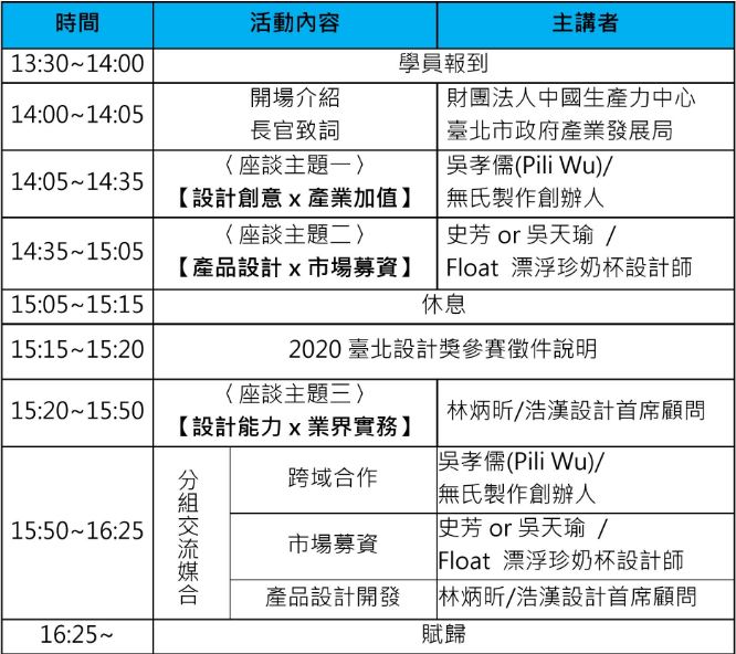 2020年「臺北設計獎」邁入第13屆,為吸引更多優秀人才與設計作品報名臺北設計獎,以及增進設計人才對於設計如何與產業鏈結之瞭解,特規劃設計師交流活動,藉由產業專家的主題座談及一對一諮詢交流,幫助設計師了解如何以設計創意帶動產業創新,提升設計作品之產業價值。