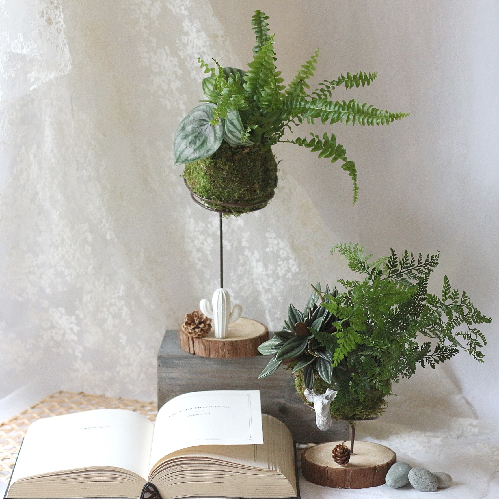 綠色的苔癬上長著一顆美麗的植物,幫您淨化空氣,淨化負能量,搭配了可愛的配件,白色的擴香石可添加精油增添香氣,更可自行添加裝飾小物與人物。