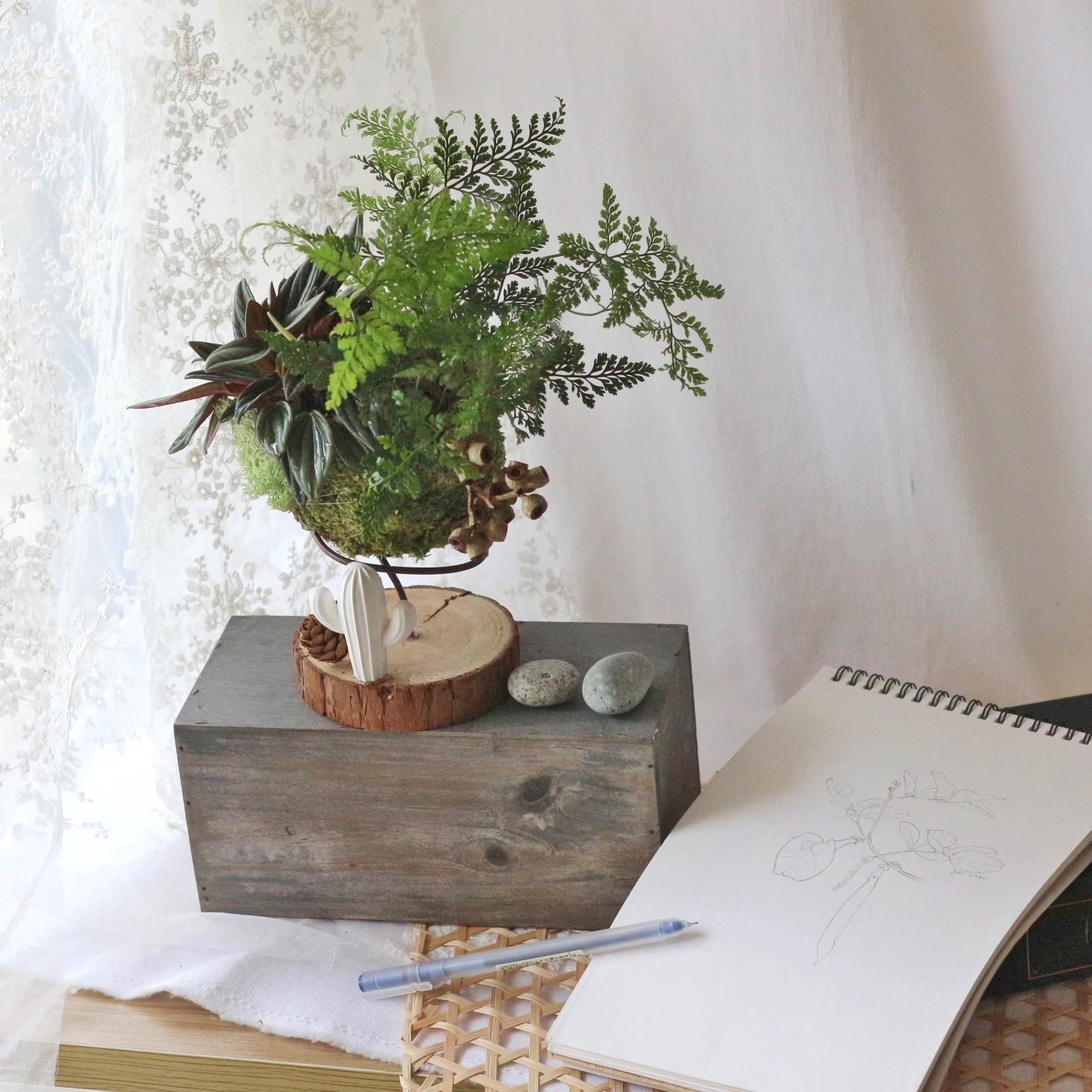 將廢棄花藝鐵絲結合椴木重新賦予生命力,搭配植栽與精油香氣,不但能充分地感受到手做的樂趣,更能從過程中體驗精油香氣 與花語籤詩的療癒力。