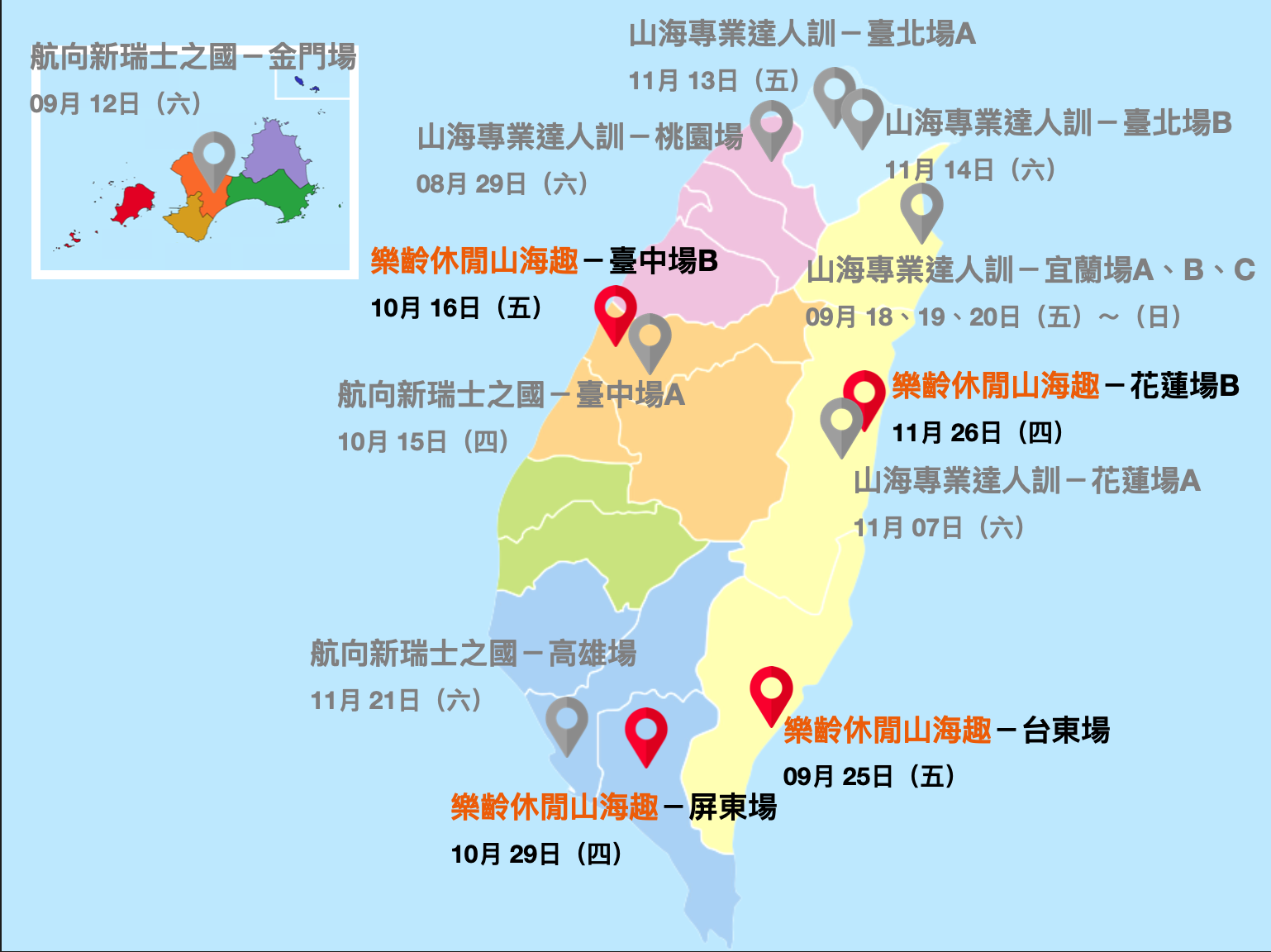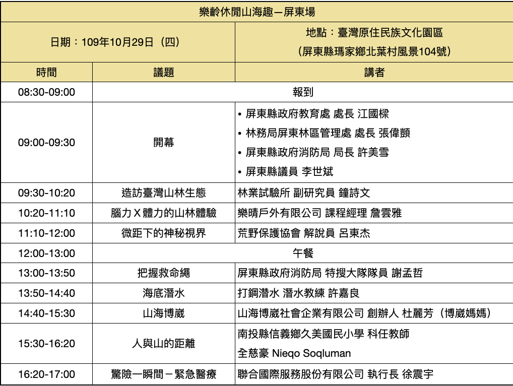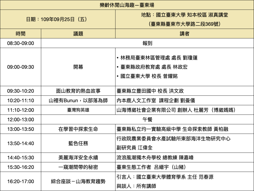 「2020面山面海教育與安全機制論壇-樂齡山海休閒趣」預計於臺東、臺中、屏東、花蓮舉辦共四場論壇活動,臺東場、屏東場、花蓮場為免費場次,邀集山海活動、文化、體驗專家分享,帶領您透過不同角度欣賞臺灣山海之美、學習謙敬山海的精神!