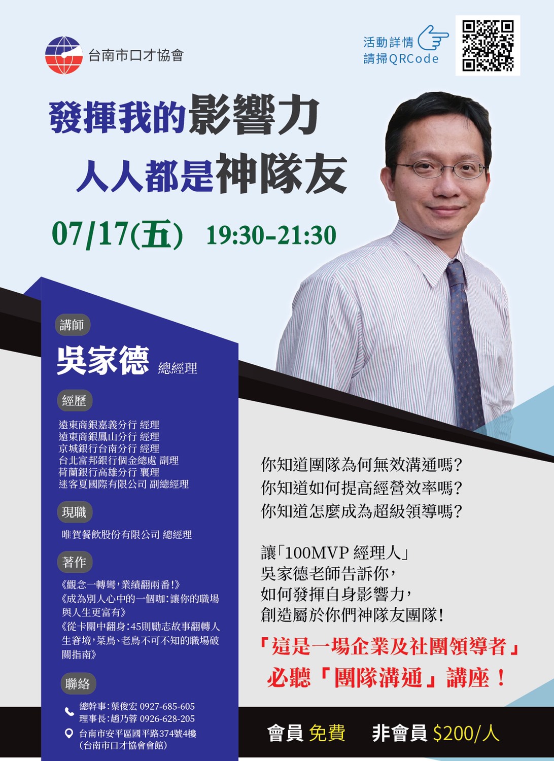 台南市口才協會至今已成立30年,秉持「心想好意、口說好話、身行好事」的宗旨,致力推廣口才藝術的理念,協會透過辦理課程,訓練口語表達能力,並定期舉辦名人講座,提供會員多元及跨領域的學習,強化專業技能及提升職場競爭力!!