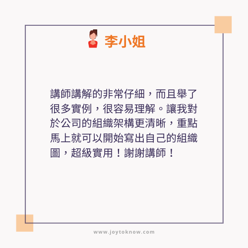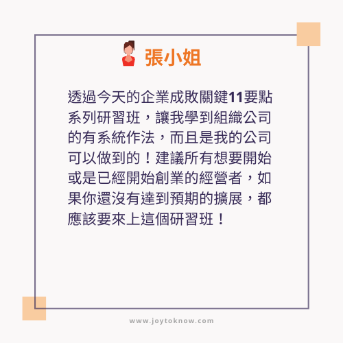 ➲ 協助過培訓與輔導的企業包含:花旗銀行、台灣人壽、微軟電腦、Gucci、傑太日煙國際(JTI)、中環、永興軸承、環泥建設、大聯大控股、南山人壽、三商保全、亞太淨水企業、中華職棒聯盟、全真補習班、利隆食品有限公司、五泰房屋連鎖、住商不動產、台灣必治妥、黛安芬、Viva電視購物台...等。