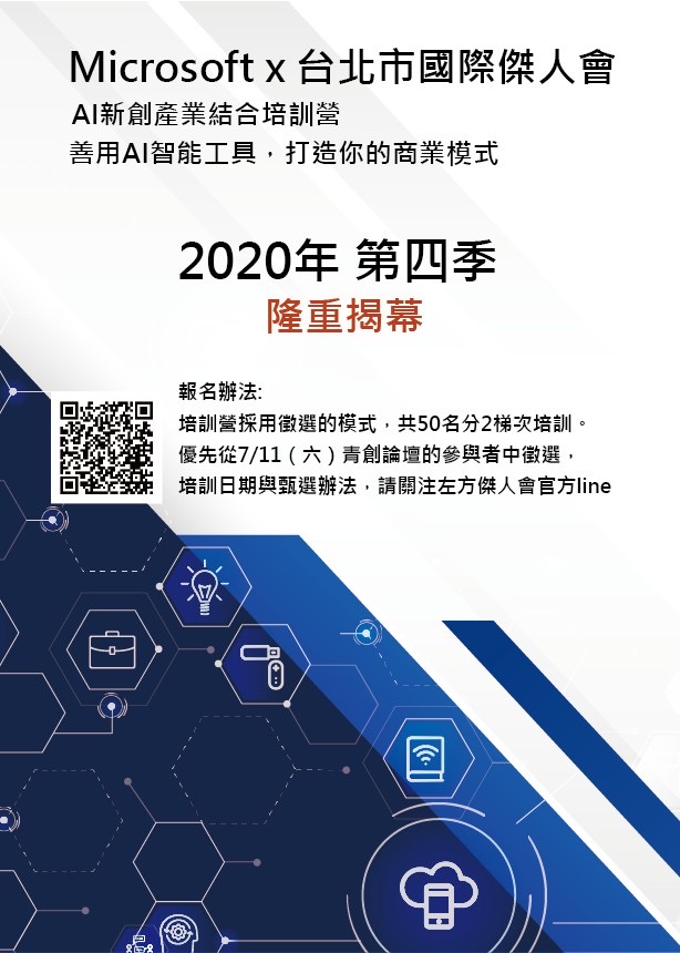 本期論壇 , 很榮幸受 Microsoft 微軟 大力支持 , 將於2020年第四季 , 舉辦 [AI新創產業結合培訓營] , 採用徵選模式 , 共50名分為2梯次培訓 , 針對後疫情時期 , 如何善用AI工具 , 打造屬於你的商業模式