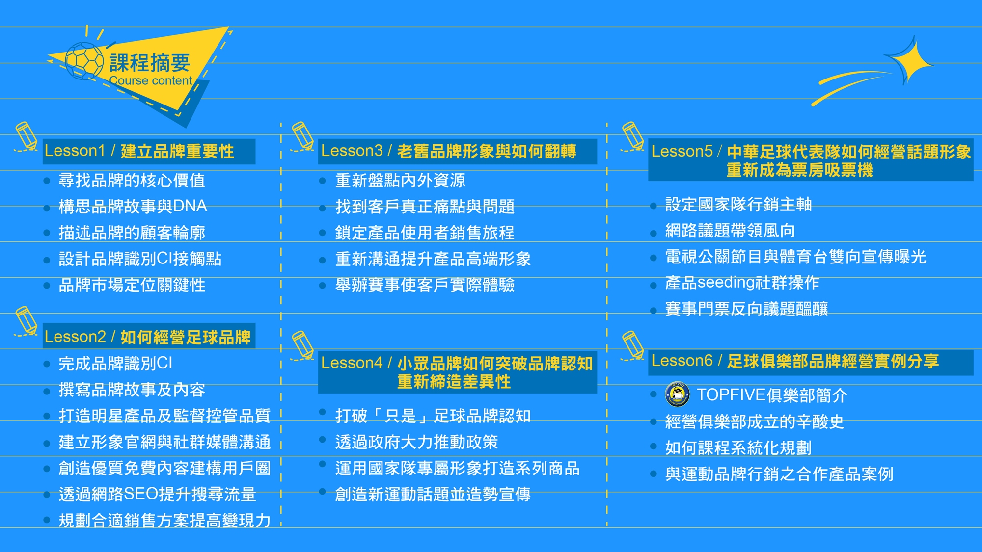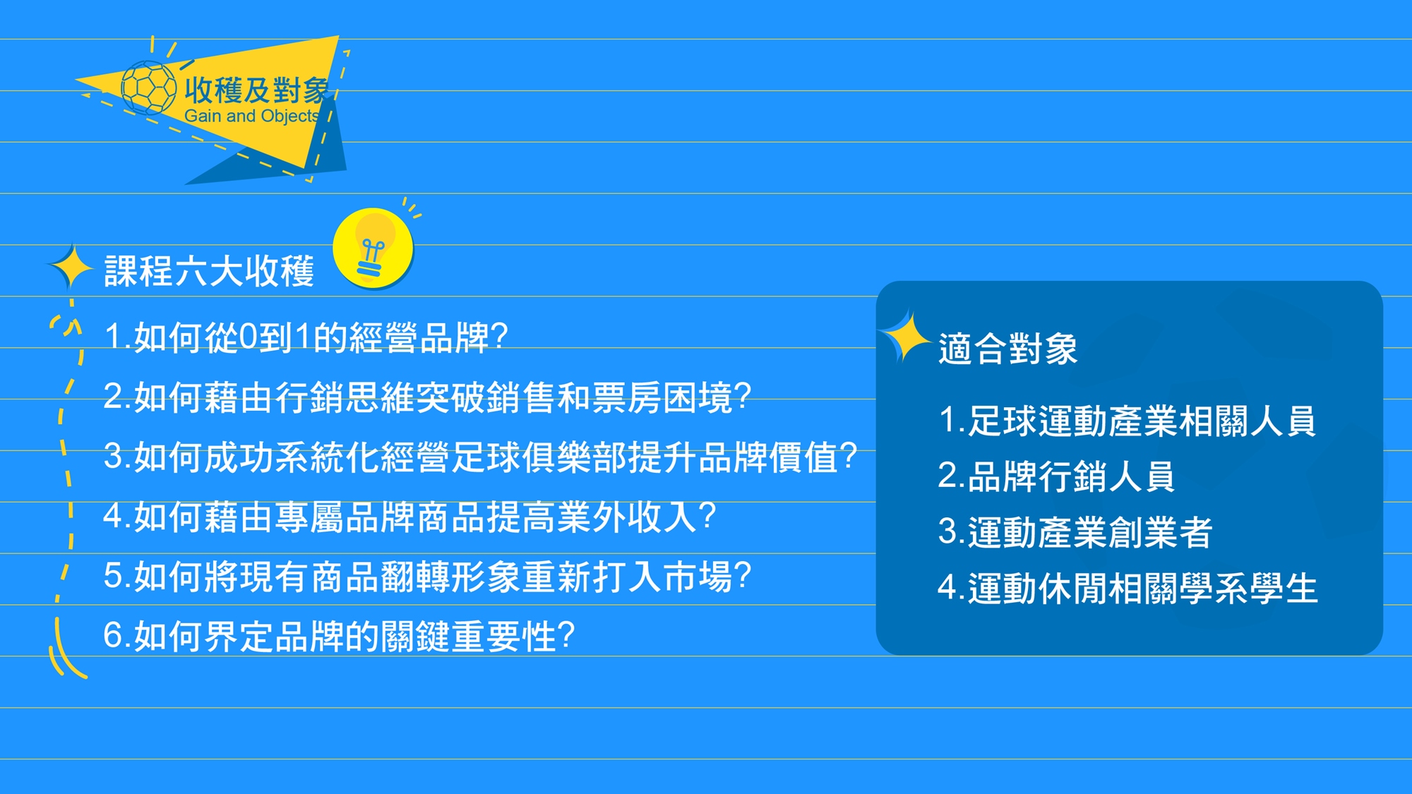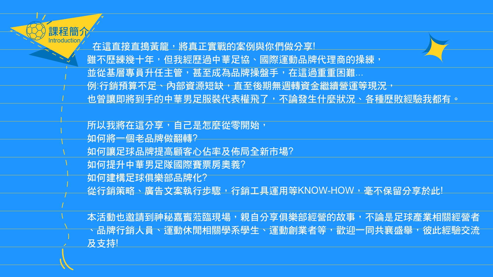 所以我將分享我是怎麼從0開始,怎麼初期將一個老品牌做翻轉? 怎麼讓足球品牌提高顧客心佔率及做全新市場佈局? 如何提升中華男足隊國際賽票房奧義、足球俱樂部如何建構品牌化?並從行銷策略,廣告文案執行步驟、行銷工具運用等KNOW-HOW,我都不保留分享給你,不見得我說的都適合你,但卻是你可以參考或是未來在經營品牌上可以避免犯下的錯誤,本次活動也邀請神秘嘉賓蒞臨現場親自分享俱樂部經營的歷程,所以不論你是足球產業相關經營者、品牌行銷人員、運動休閒相關學系學生、運動創業者,都很適合你,以上是我的經驗交流講座,歡迎各位支持!