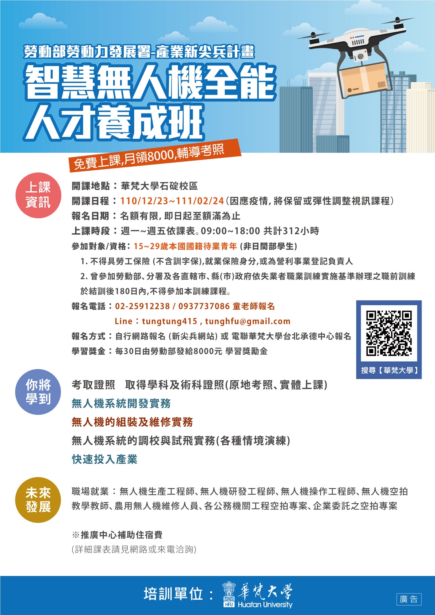 15 | 智慧無人機全能人才養成班 | 校本部 | 12/23~111/2/24 |