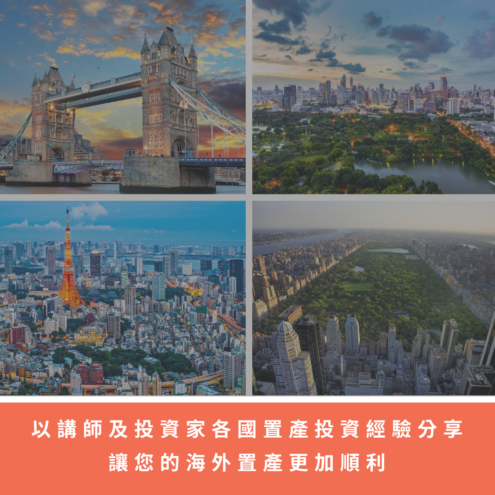 講師分享自身,及經手的投資家於海外各房地產熱點的置產各項經驗,提供您借鏡參考,讓您的海外置產之路能夠少走彎路,機會難得。