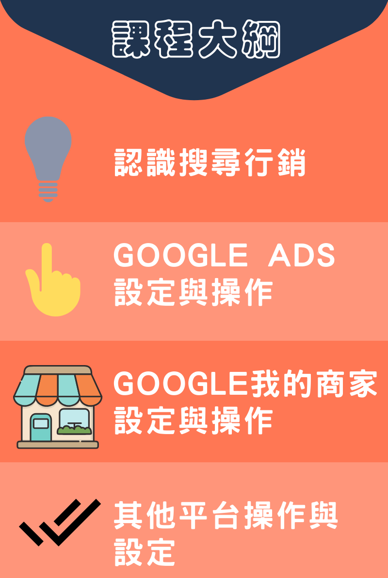 本次課程,邀請到知名電商成效優化顧問王如沛,帶大家從最設立廣告帳戶起步,進而挑選關鍵字與廣告類型,同時結合「Google我的商家」,並透過追蹤數據提高轉換率,讓你不僅從此減低依賴廣告代理商,更能花小錢投資換來大報酬,親手用關鍵字廣告讓線上/線下生意都提升到下個檔次。