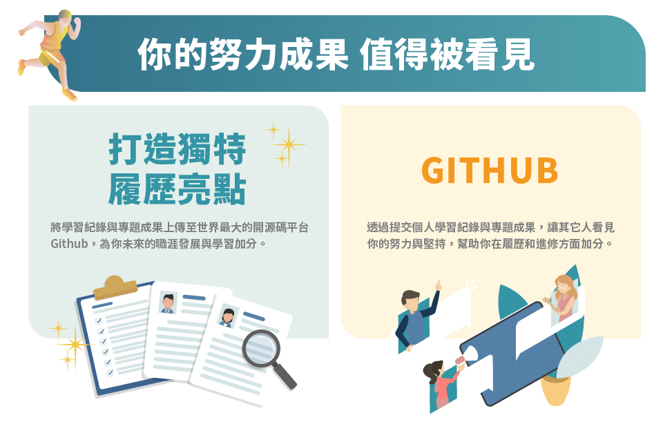 你在本活動的學習紀錄與專題成果,將上傳至世界最大的開源碼平台Github,你可以反覆練習與修改上傳的程式碼與內容,提升對各知識點的掌握,為你未來的職涯發展與學習加分。