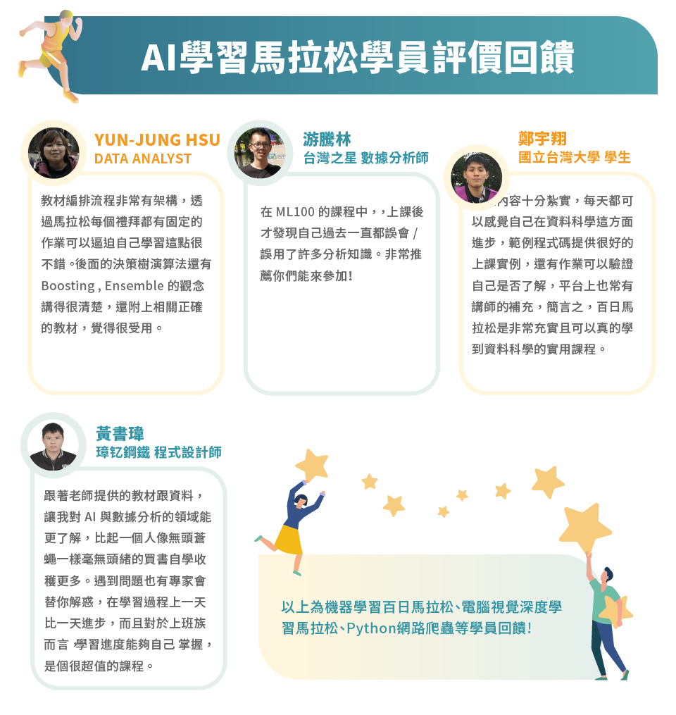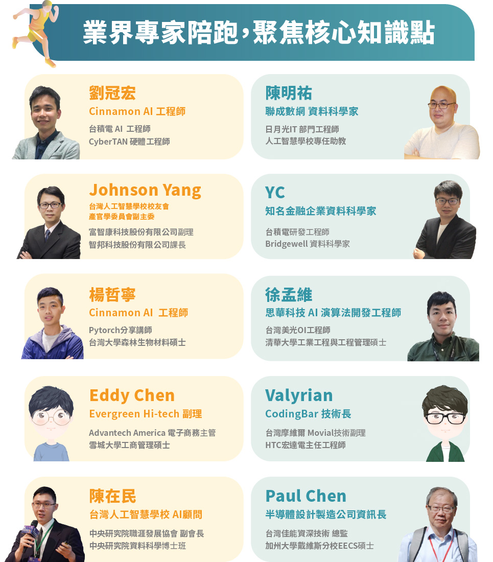 本活動匯集了大量台灣優秀的AI專家與專業的軟體工程師,彼此分享與優化學習過程後,規劃本課程的最佳學習地圖,幫助 AI+NLP 學習者能夠以更有效率的方法學習。加入專家們的學習社群,你能更快掌握產業應用的關鍵知識。此外,透過程式實戰檢驗學習成效,留下你的實戰紀錄,讓其它人看見你的能力與努力。