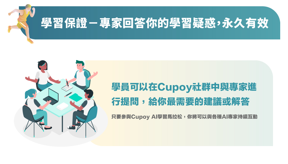 - 只要參與Cupoy AI學習馬拉松,你將可以與各種AI專家持續互動,永久有效