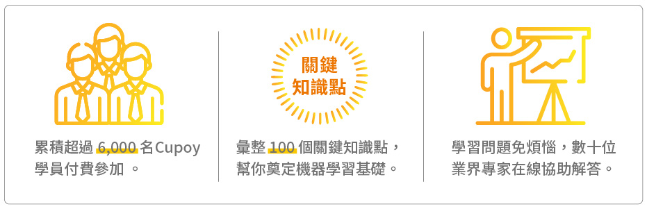- 學員可以在Cupoy社群中與專家進行提問,包括基礎知識、實務開發、套件安裝、解題方法、程式除錯、參數調校.......等各種問題,專家都會為你找出問題癥結點,給你最需要的建議或解答。